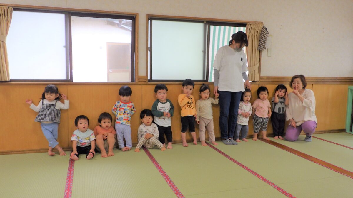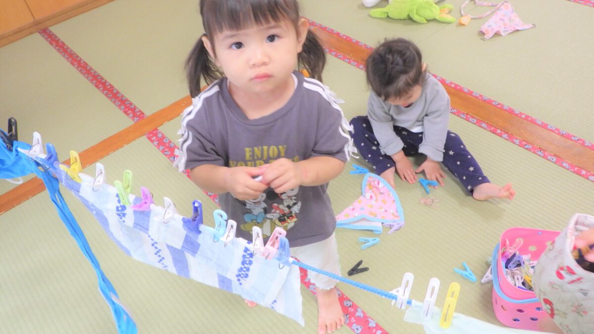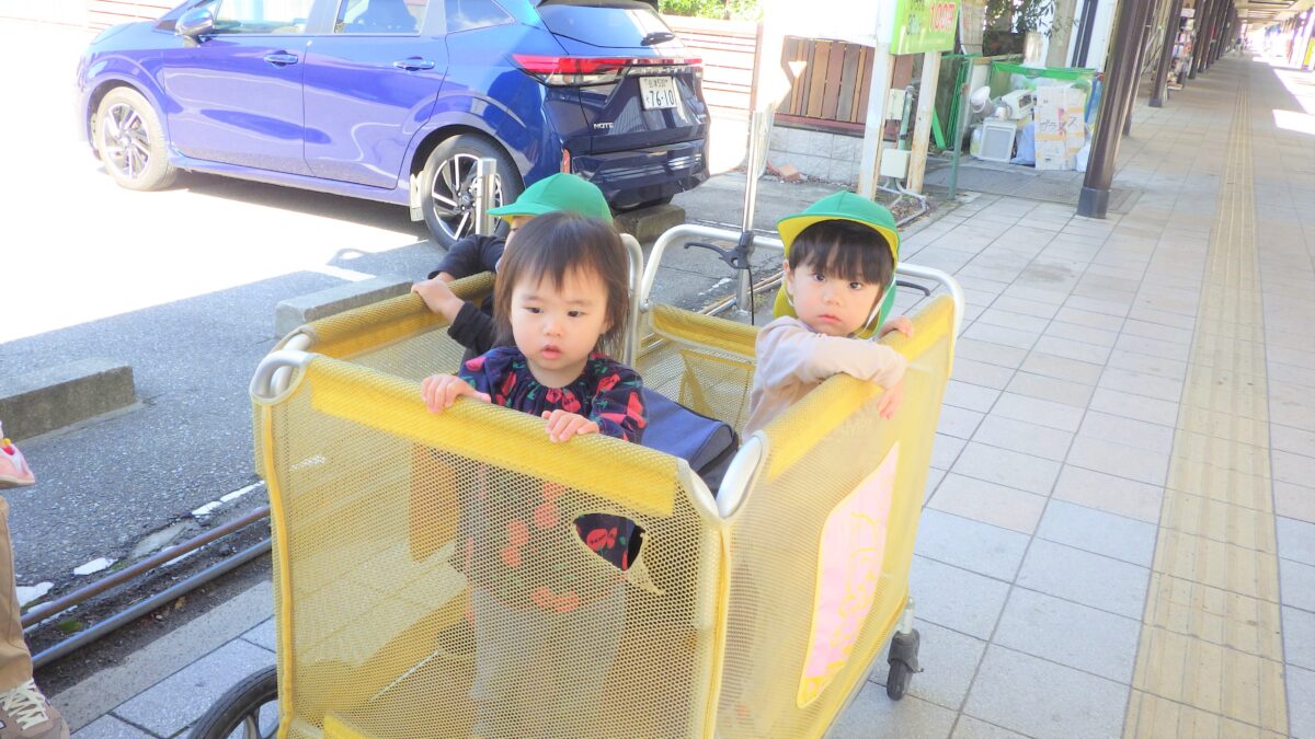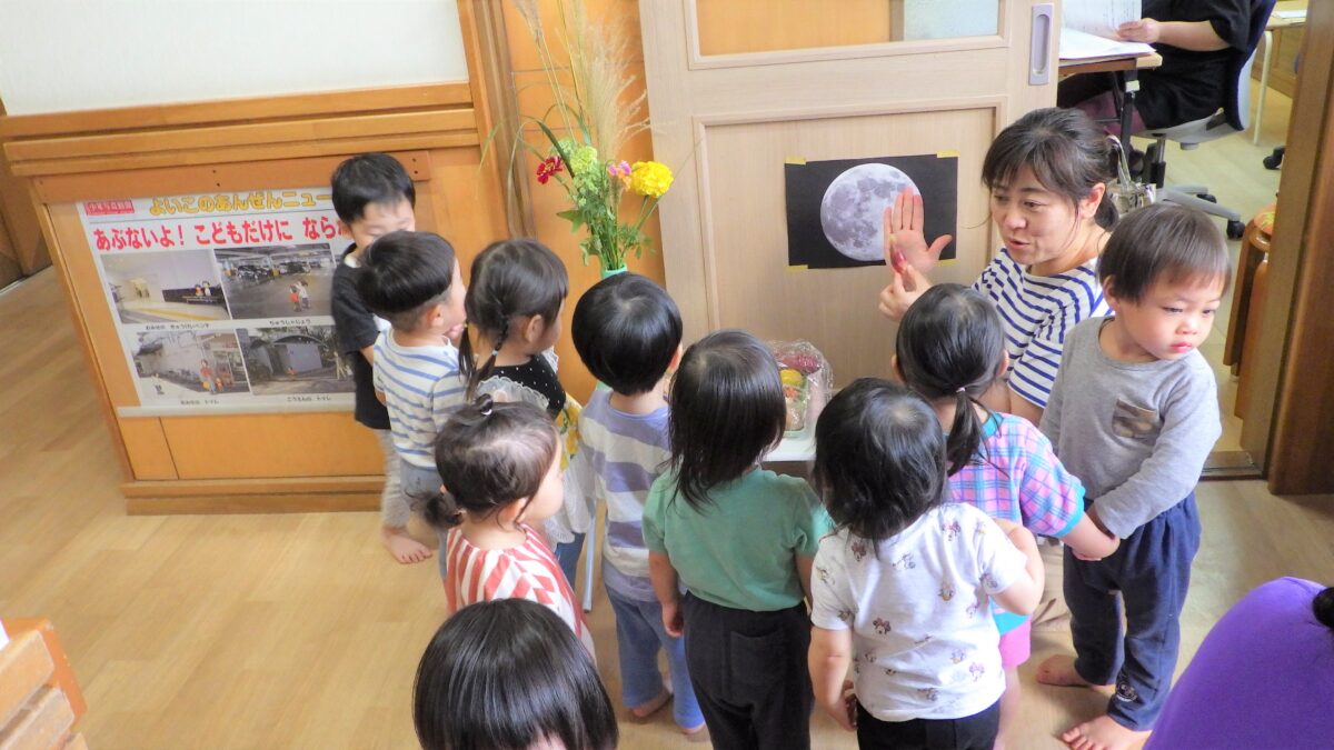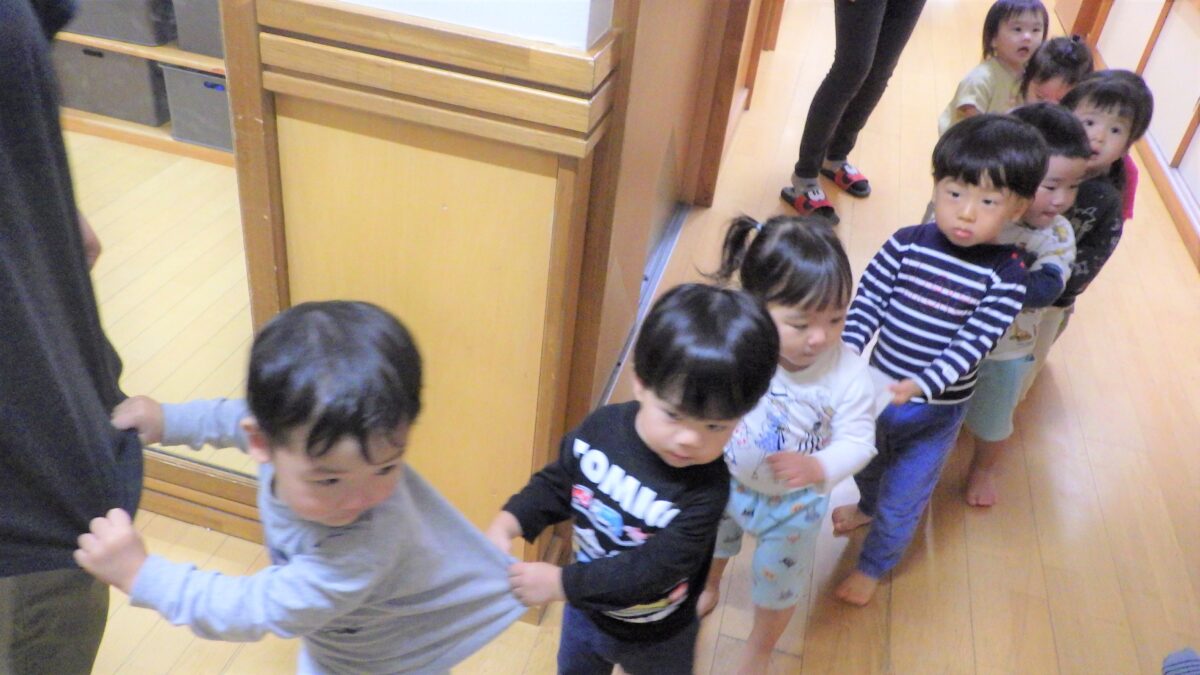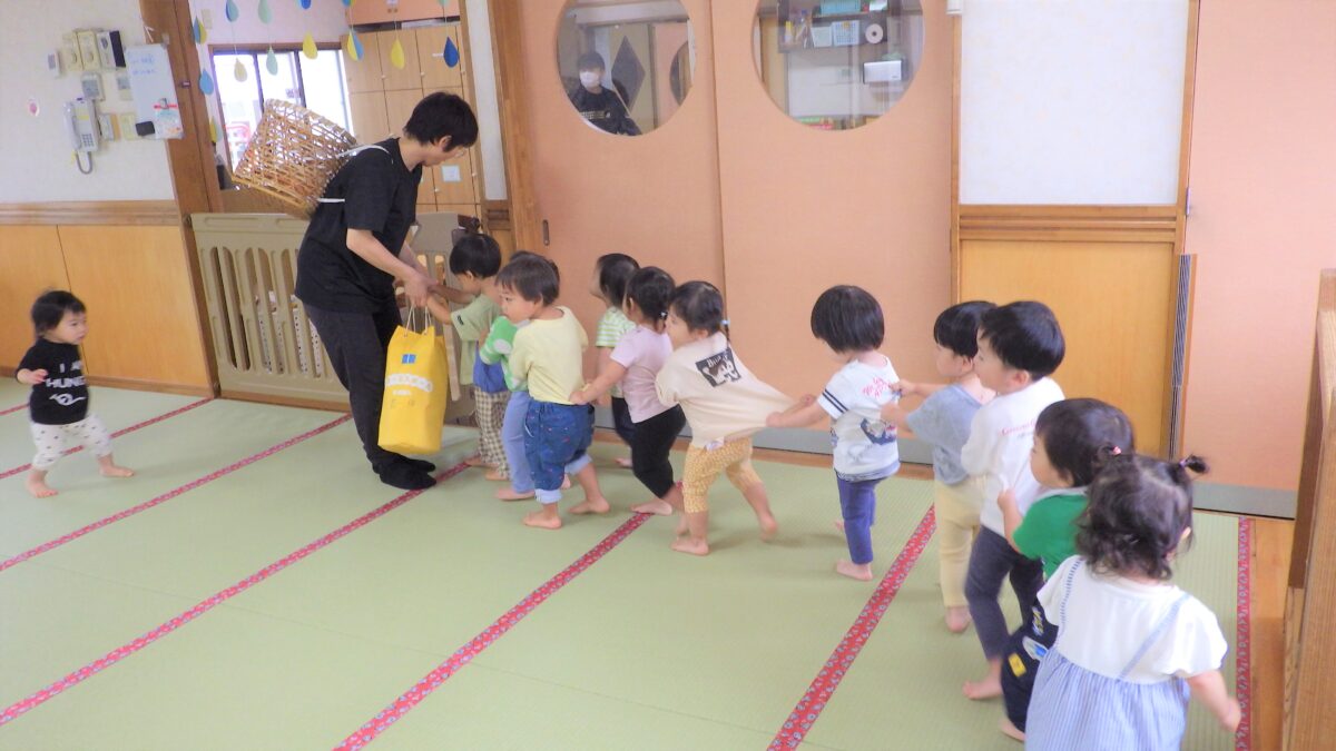 園内散歩を楽しむひよこ組の子どもたち。お友だちとつながってお兄さんお姉さんのクラスを探索しています。キョロキョロしながらも、お友だちのところは絶対に離さないぞ!と力強く握っています(^_-)-☆十五夜のお供え物を見たり、水槽の魚を見たり・・・。毎日楽しみね!