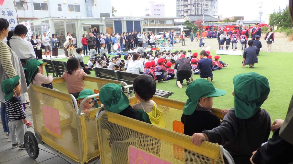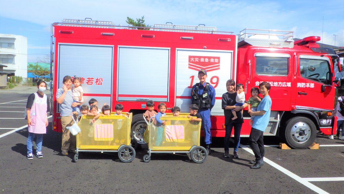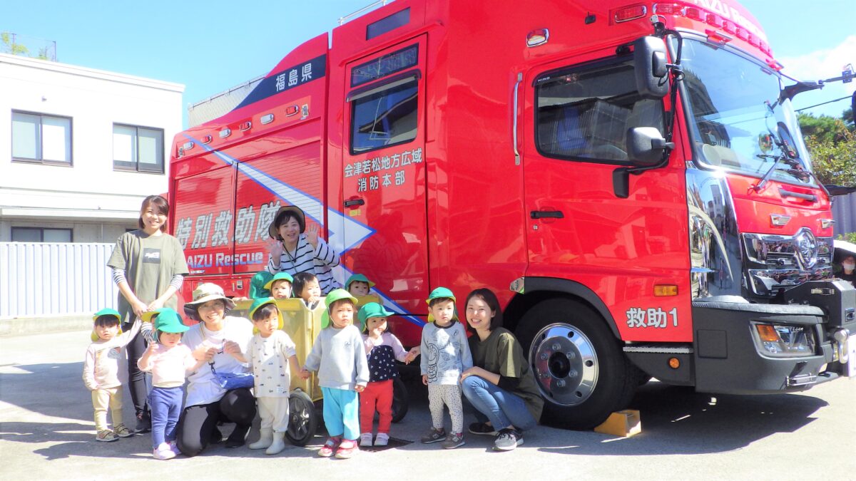 若松第一保育園の避難訓練と散歩中に出会ったのぞみ保育園の消防車の前で、記念写真を撮らせていただきました!しかも、防火フェスタでは、最新のはしご車までも見ることが出来、さらに消防車愛が深まったひよこ組です🚒
