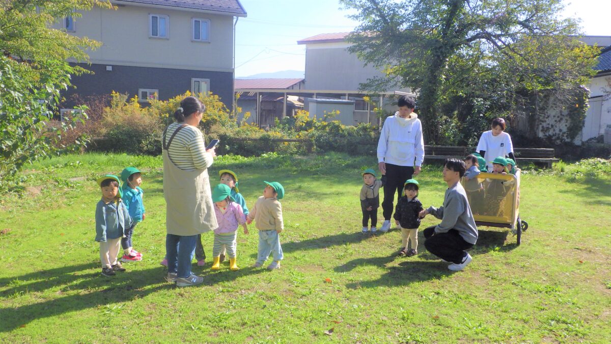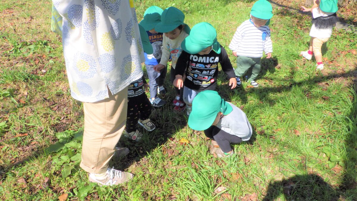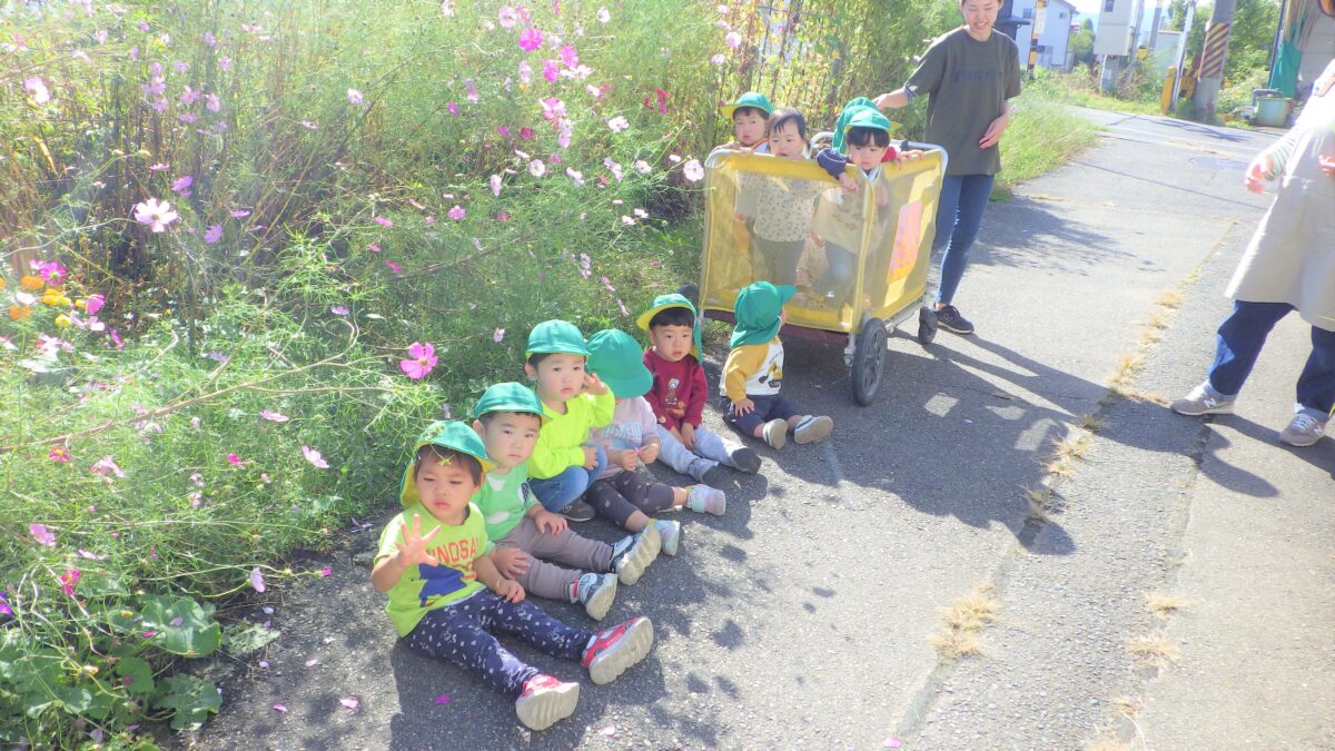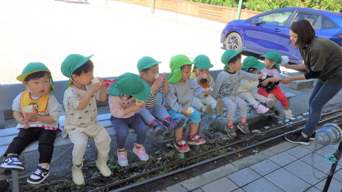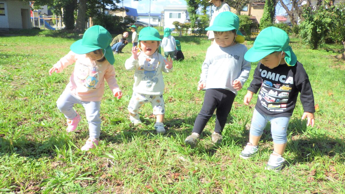 毎日の散歩でも、新しい発見がたくさん!野口英世青春広場では、あり?くも?を見つけてじっと観察…。日新町公園でも、カエルやバッタを探したり、秋ってとっても楽しい!疲れたらお茶を飲んで一休み。体をたくさん動かしながら、秋を満喫しています!