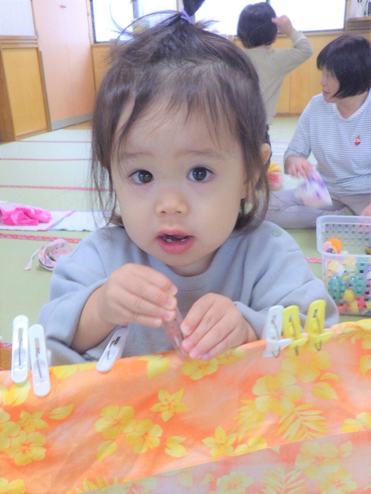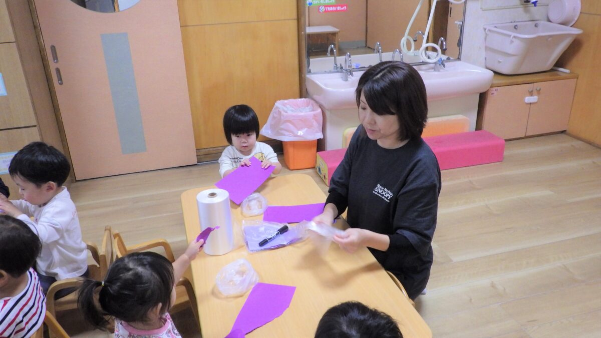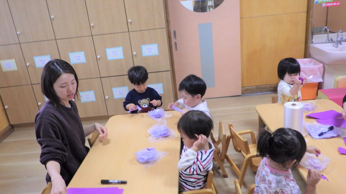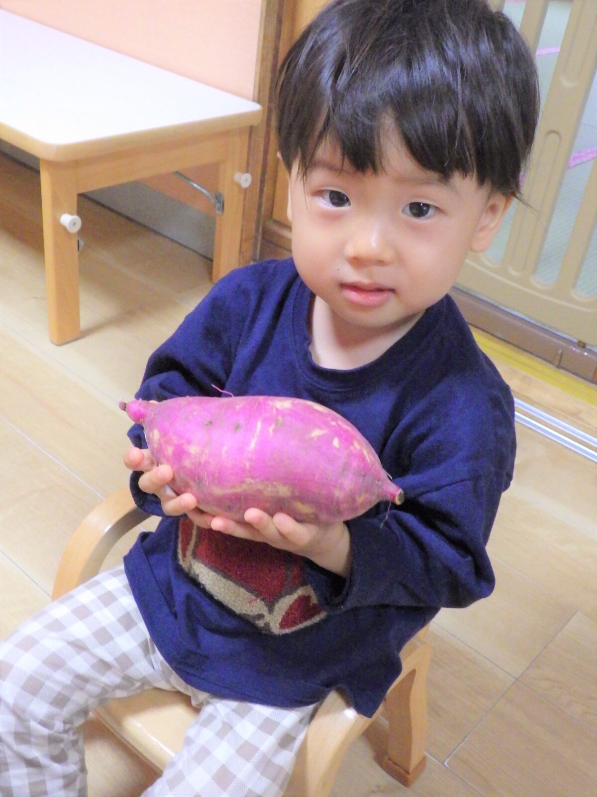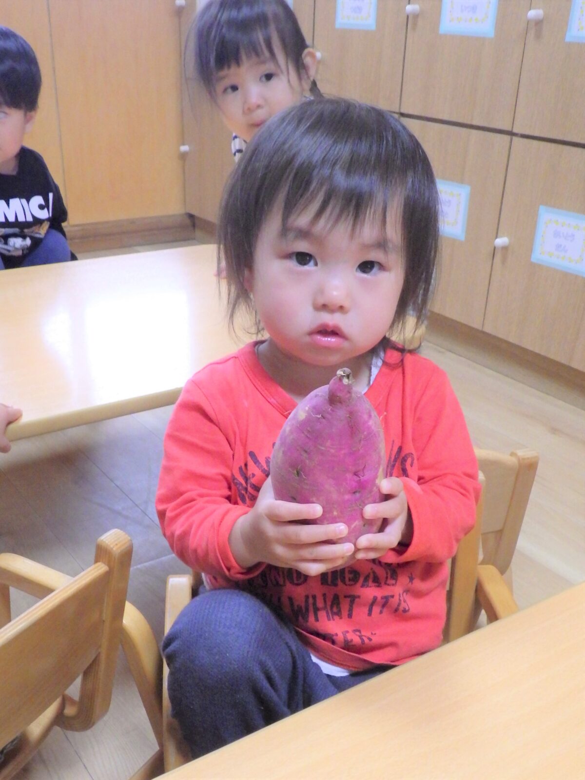 「さつまいもっておおきいななぁ!」と手に取って、においを嗅いだり、撫でてみたり。その感動が冷めぬうちに、11月の製作として、焼き芋屋さん作りをしました。「おいしいおいもになりますように!」と心を込めて作りました。お楽しみに!