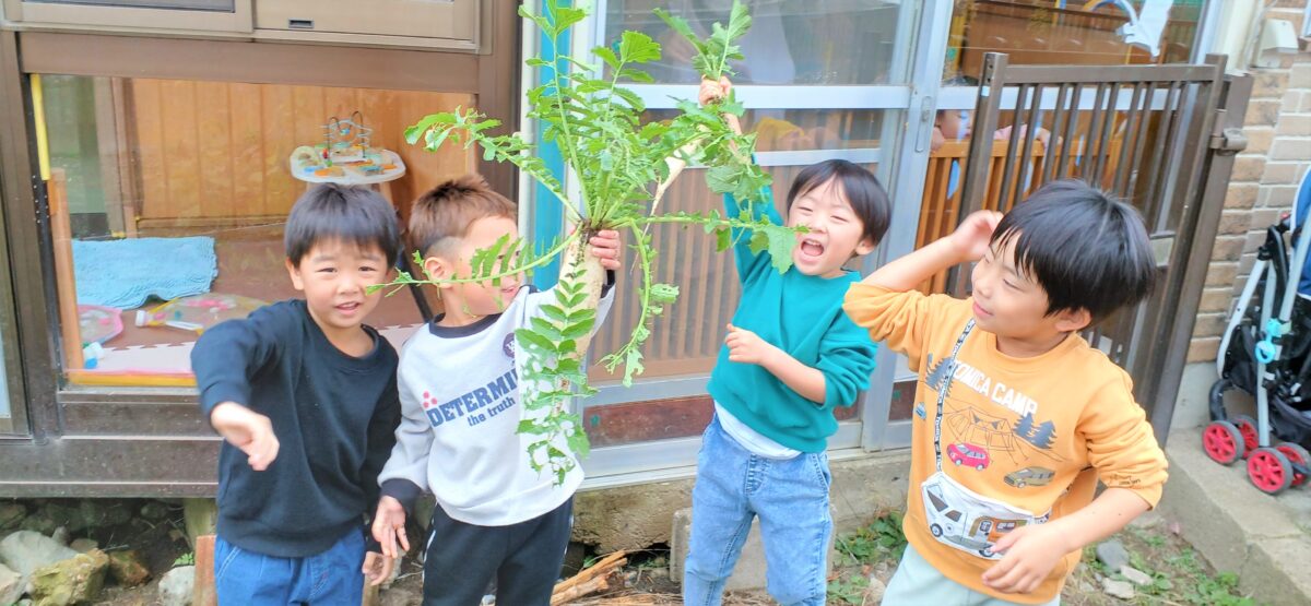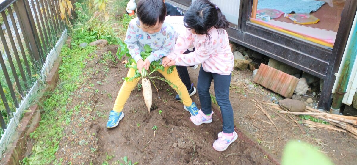 9月から育てている大根とほうれん草の収穫を行いました。育ててきた野菜の中で一番手をかけてきたこともあり、実際に食べた時は満足感や達成感でいっぱいの表情をしていたのが印象的でした。