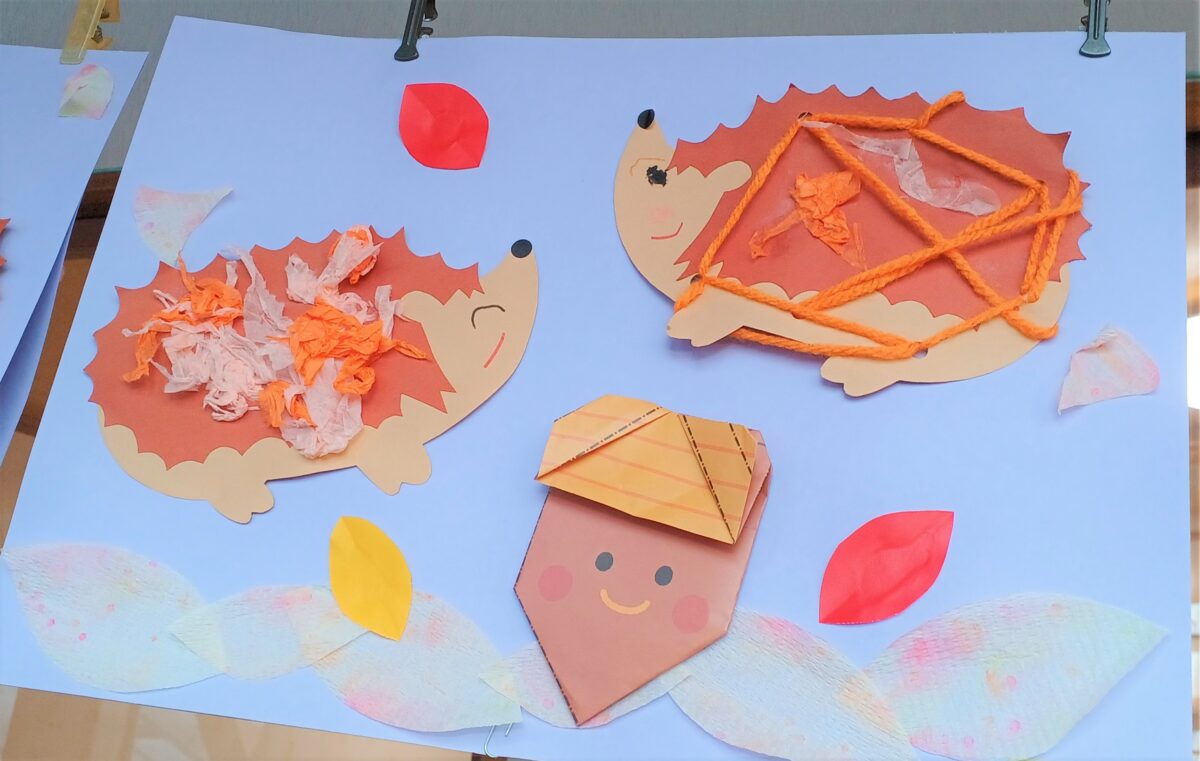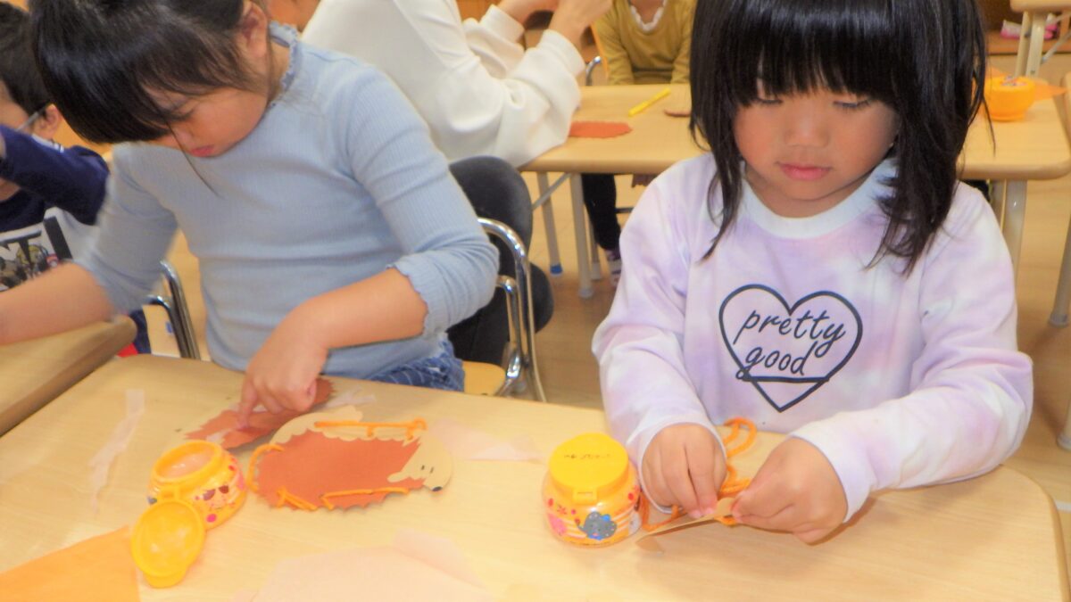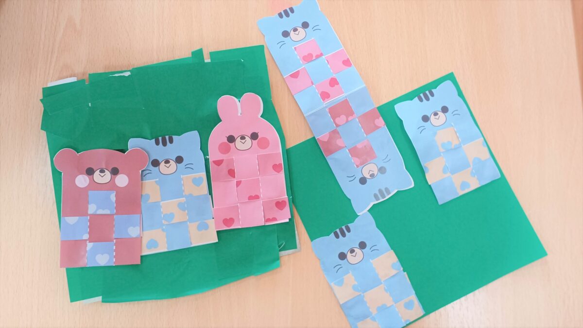 11月になり室内遊びも盛り上がっています。製作では紐通しや格子編みにも挑戦しました。