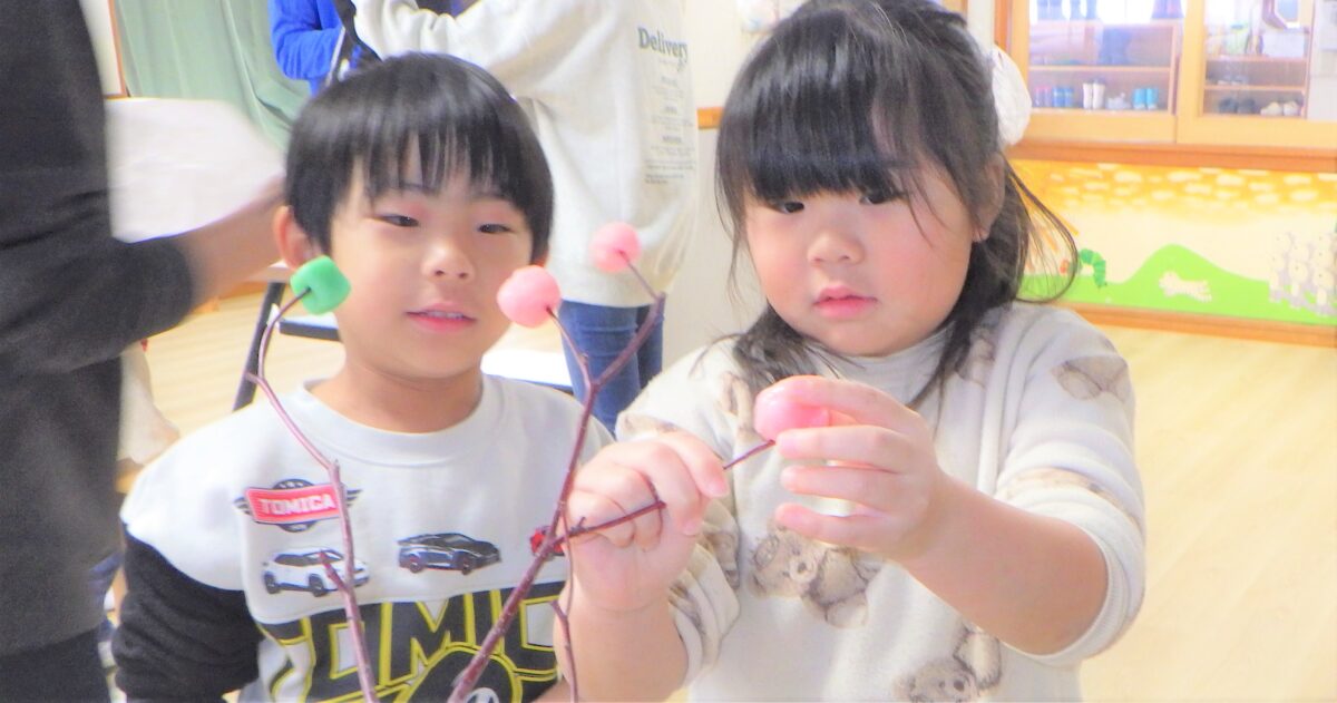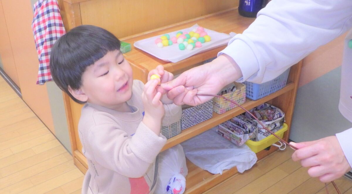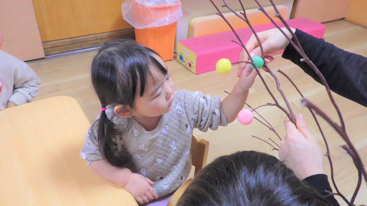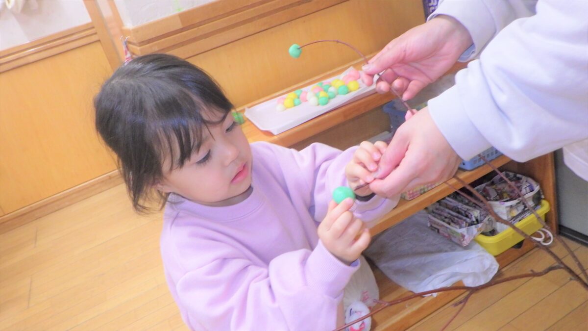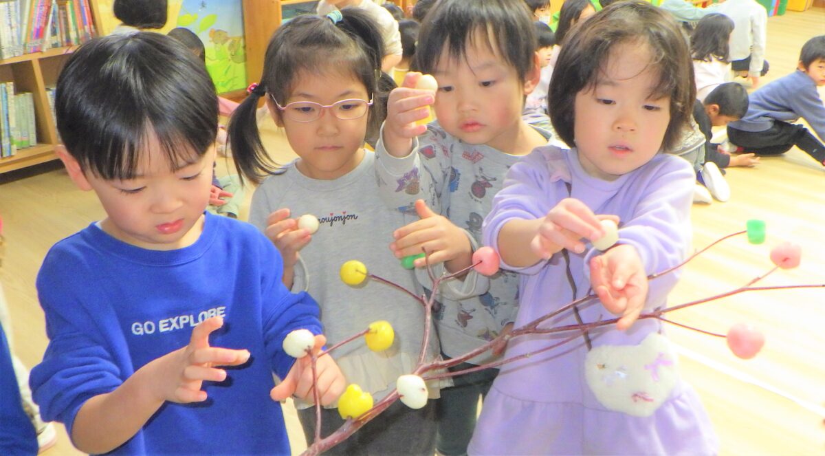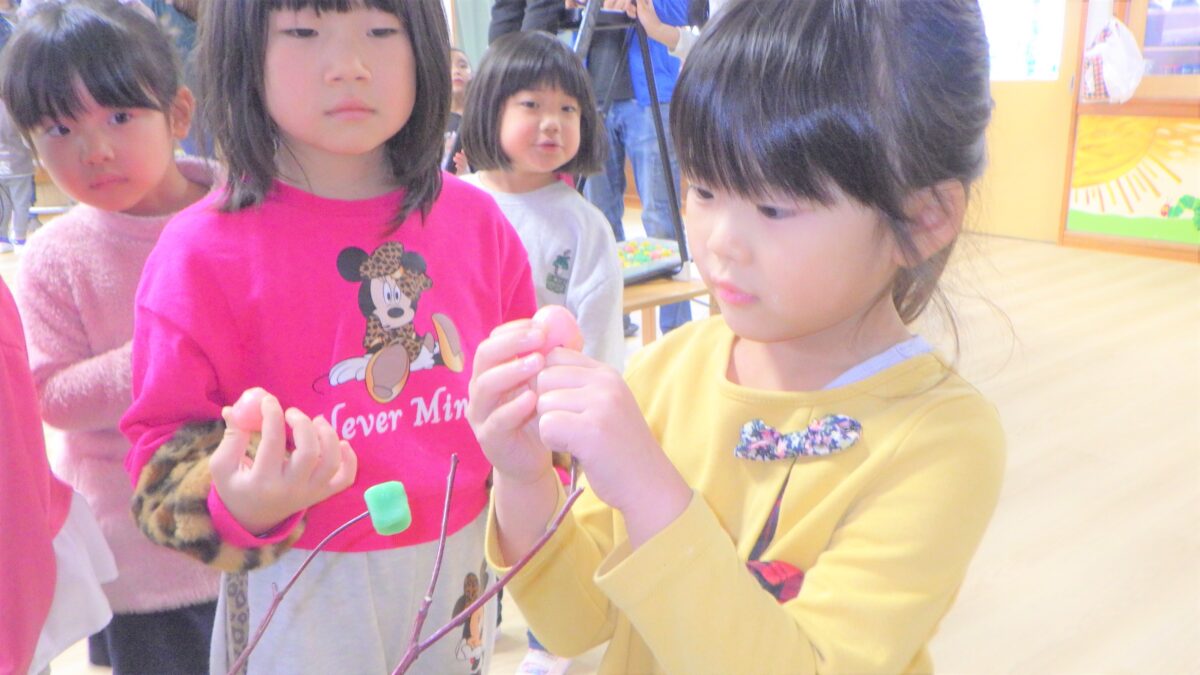 赤、黄、緑、白それぞれのだんごには意味があることを教えてもらったので、「黄色い団子がいい!」「緑色の団子がいい!」と団子の色を理解して若木にだんごを刺す子もいました🍡