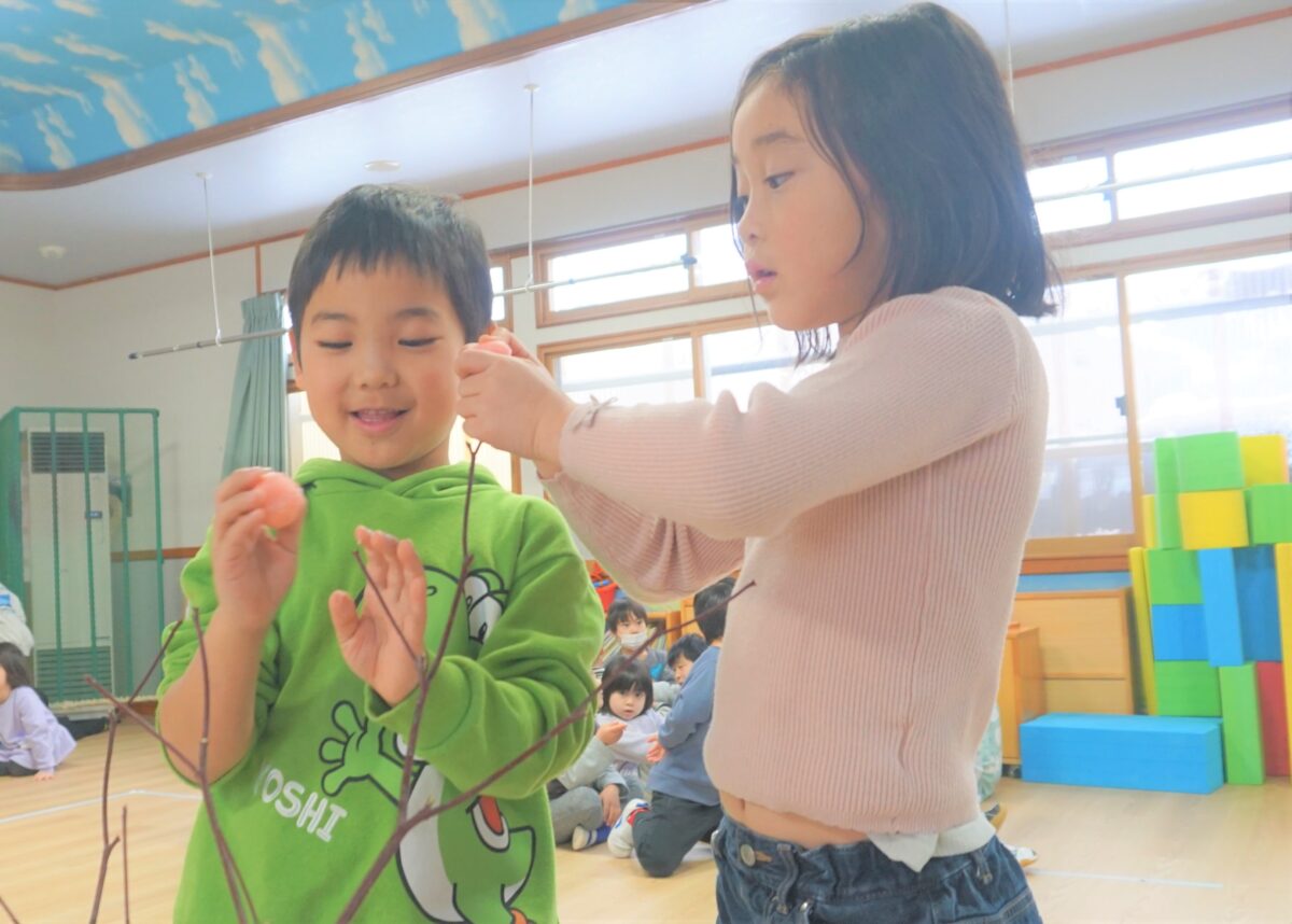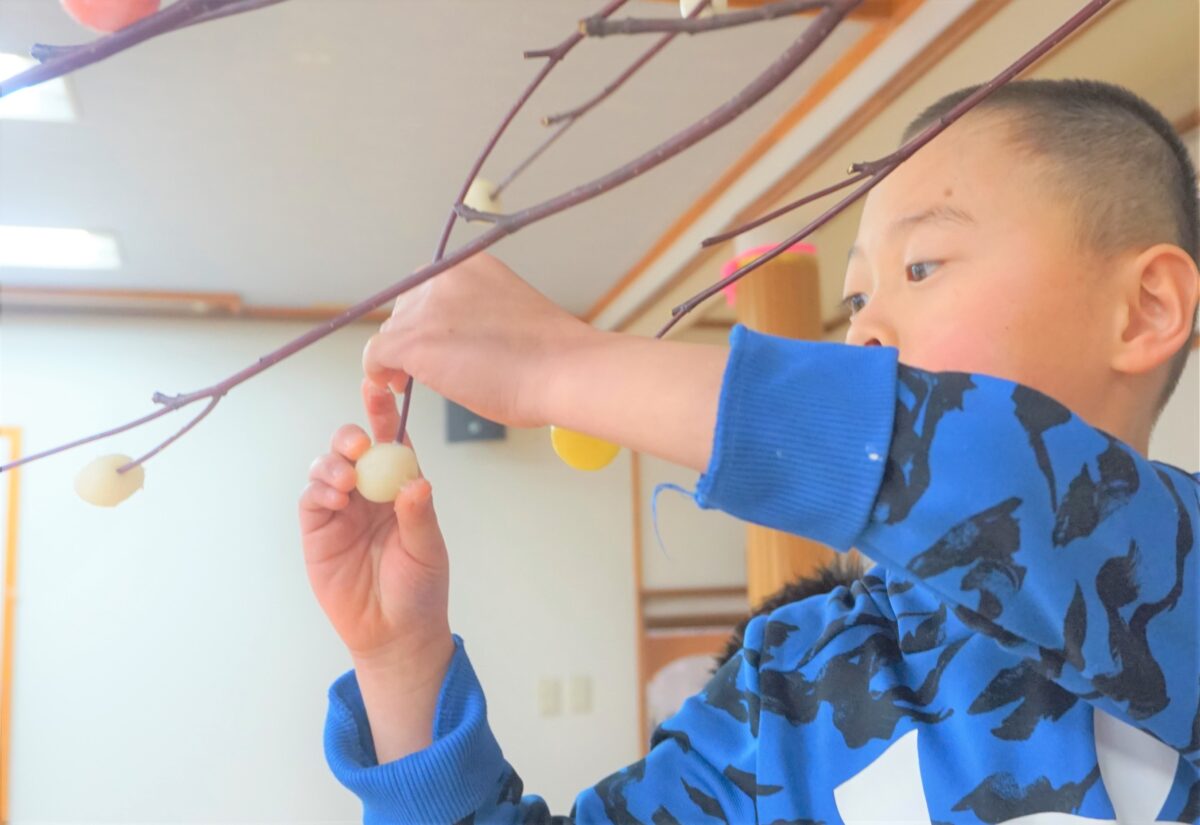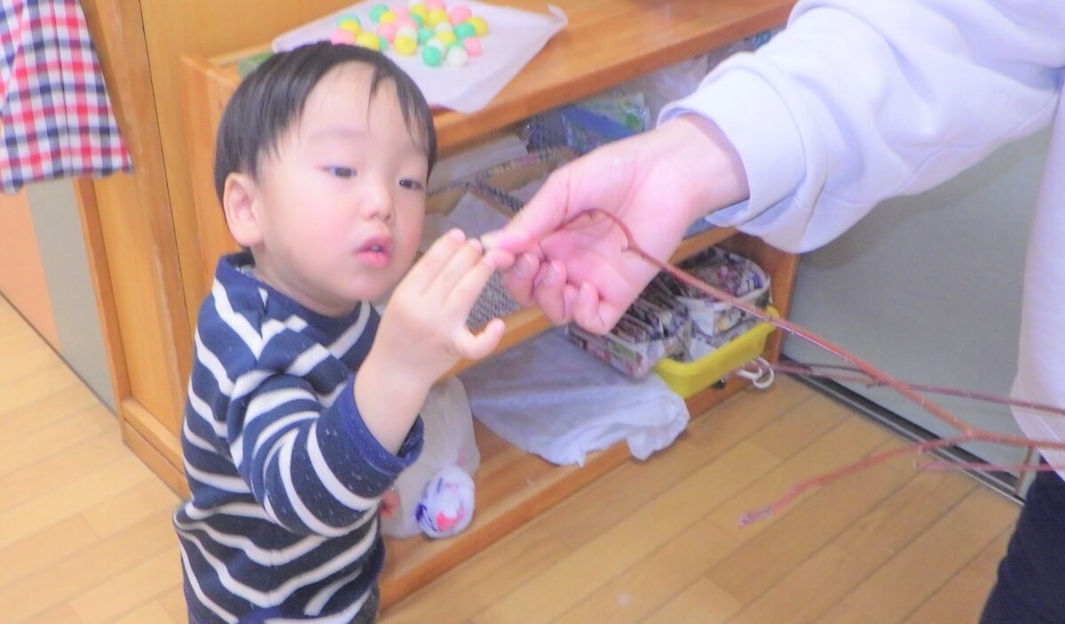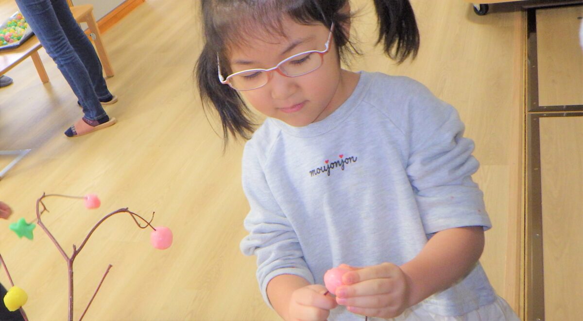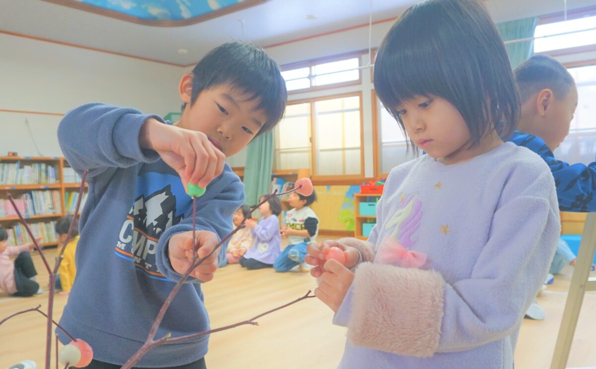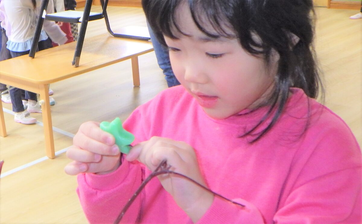 赤、黄、緑、白それぞれのだんごには意味があることを教えてもらったので、「黄色い団子がいい!」「緑色の団子がいい!」と団子の色を理解して若木にだんごを刺す子もいました🍡