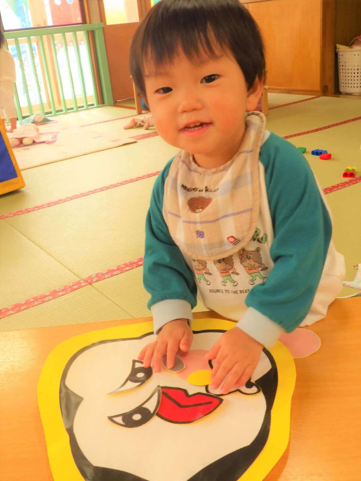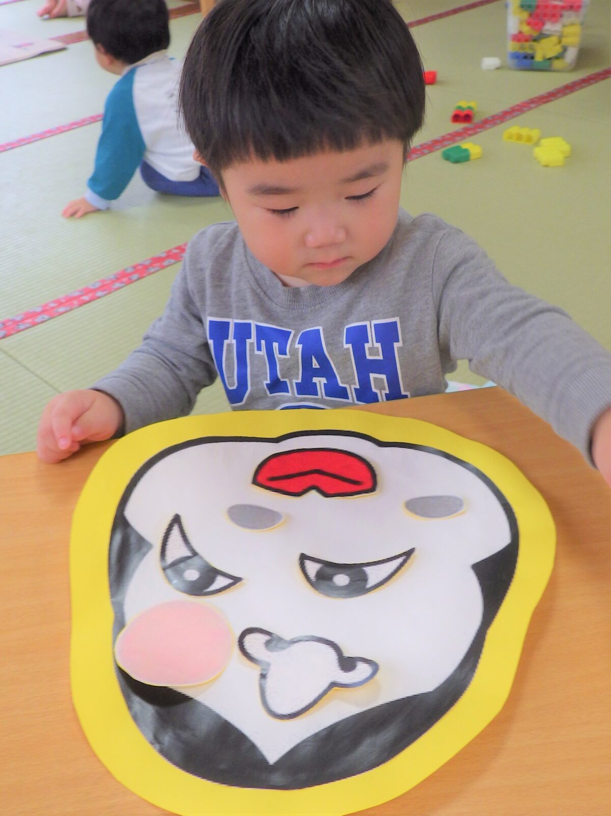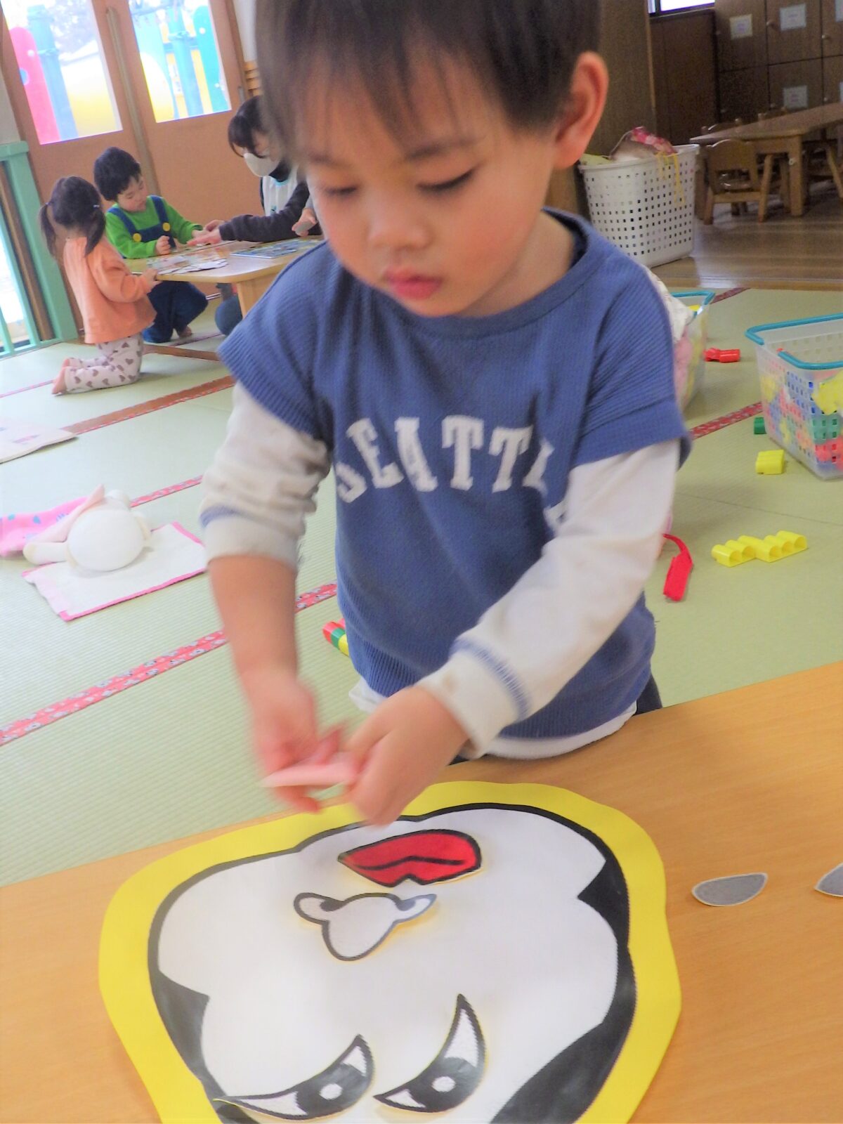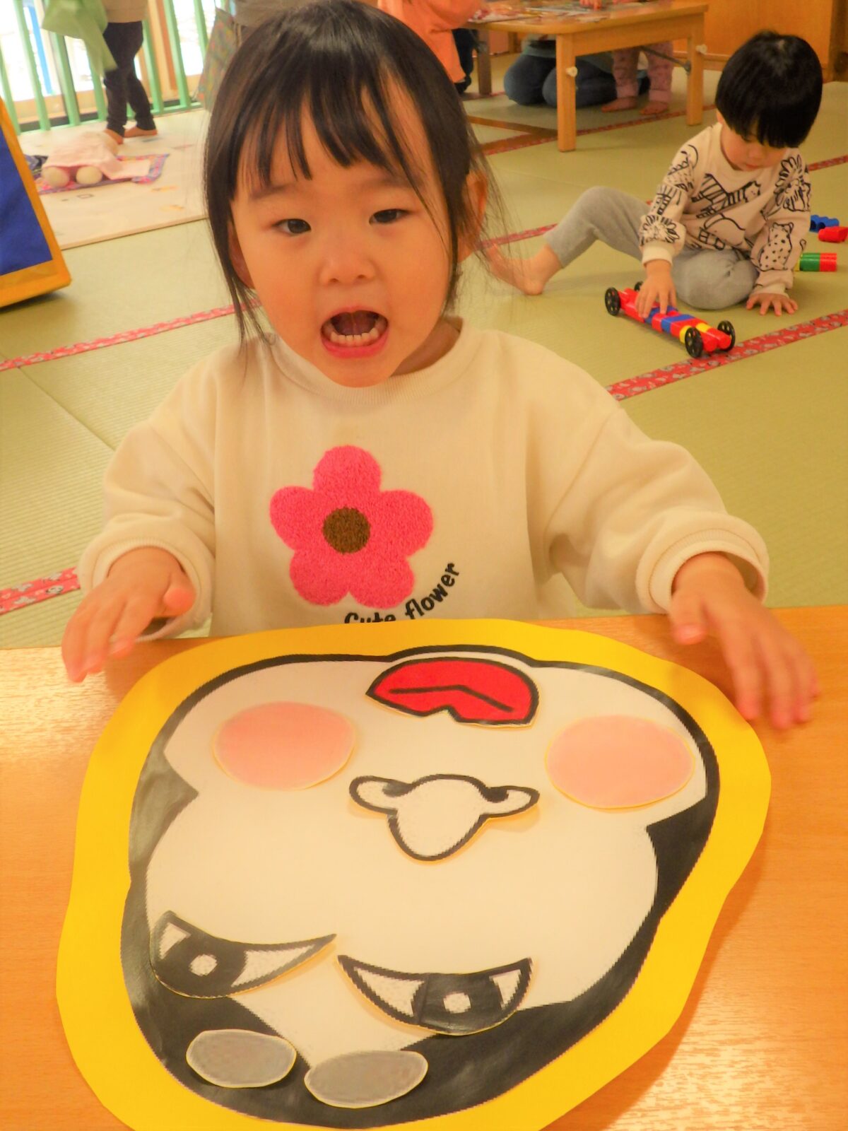 一年の始めを福笑いでスタートしたひよこ組の子どもたち♡お正月遊びの一つとして明治時代に定着したもので「笑う門には福来る」ということわざに関連し、笑いを通じて家族の幸せを願う意味があるそうです。ひよこ組の子供たちが一年間笑いと幸せに満ち溢れた年を過ごせますように!みんな一生懸命並べていました。一つとして同じ顔がないのが見ていて面白いですね♡