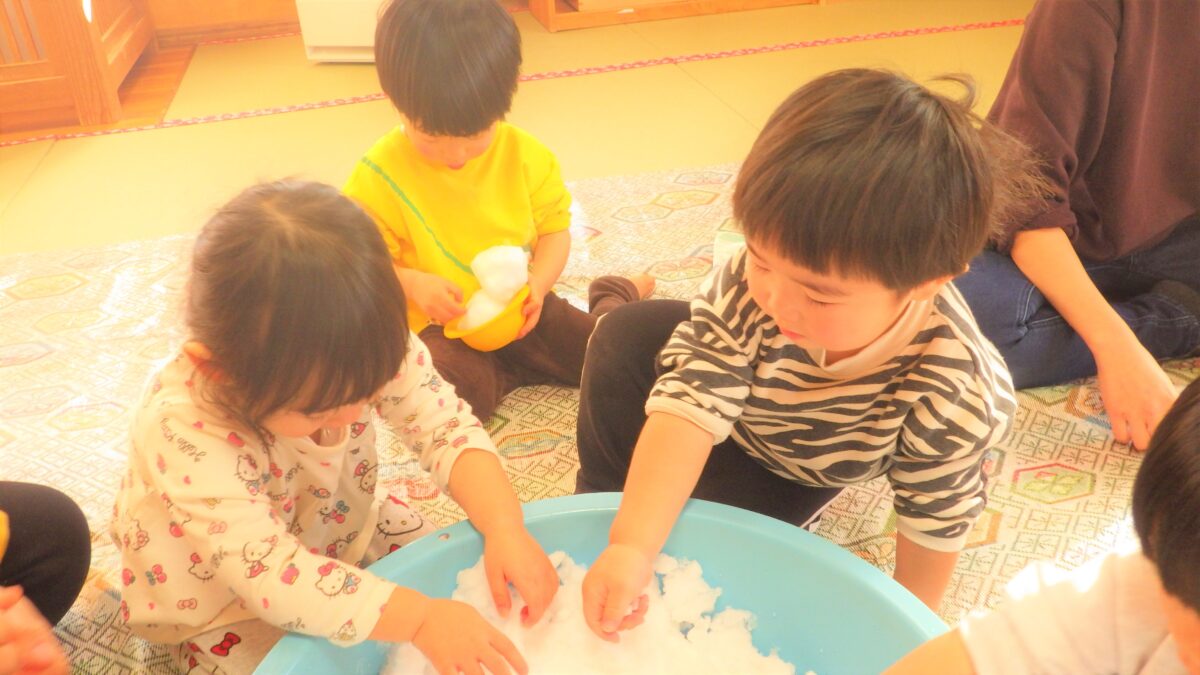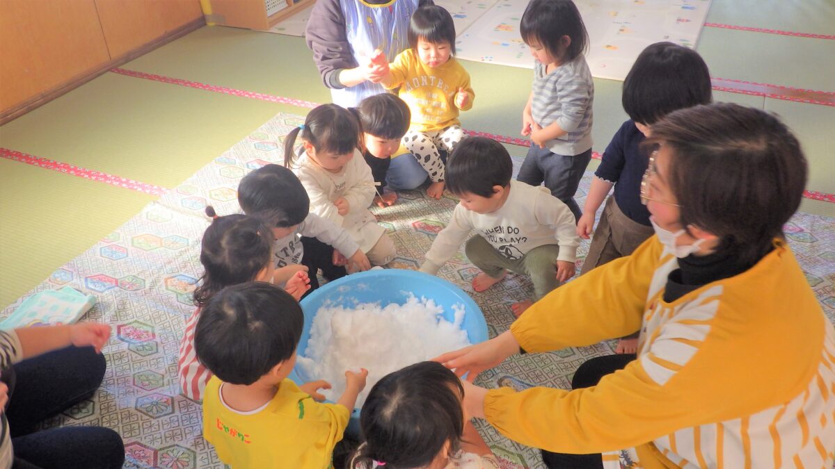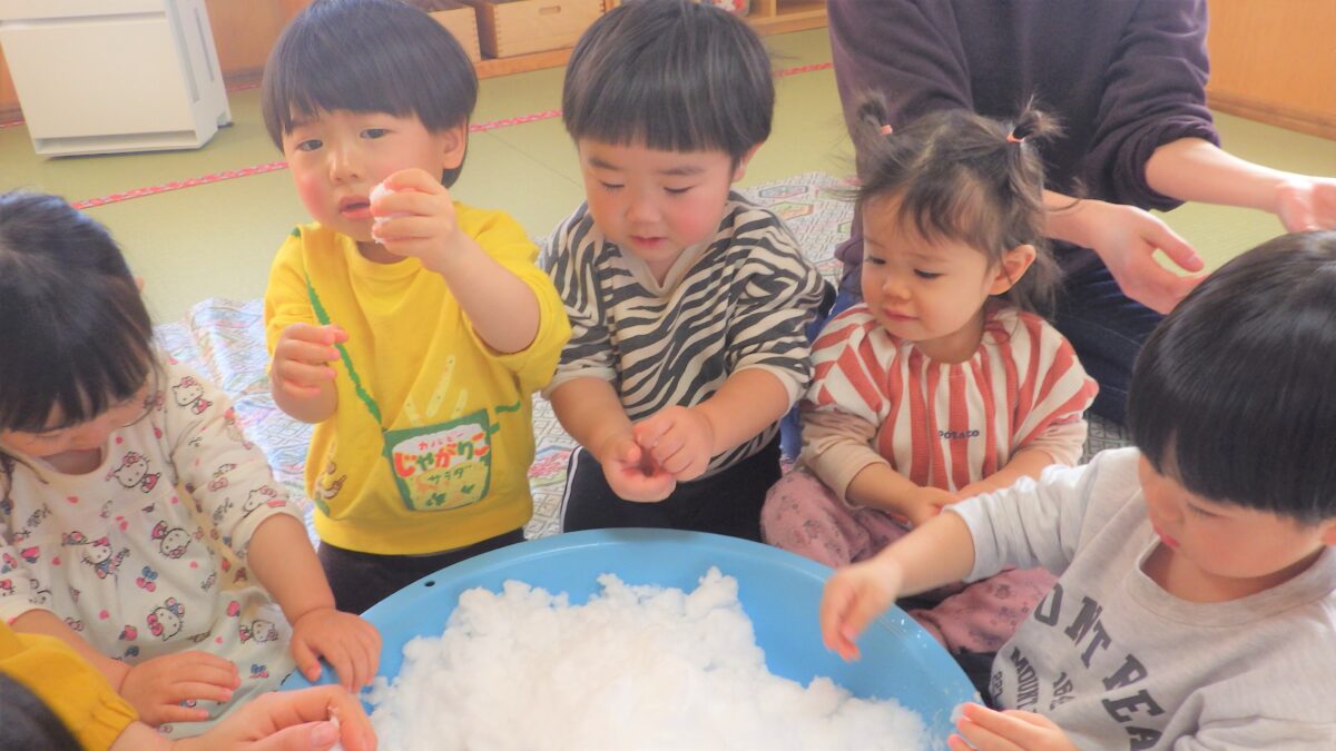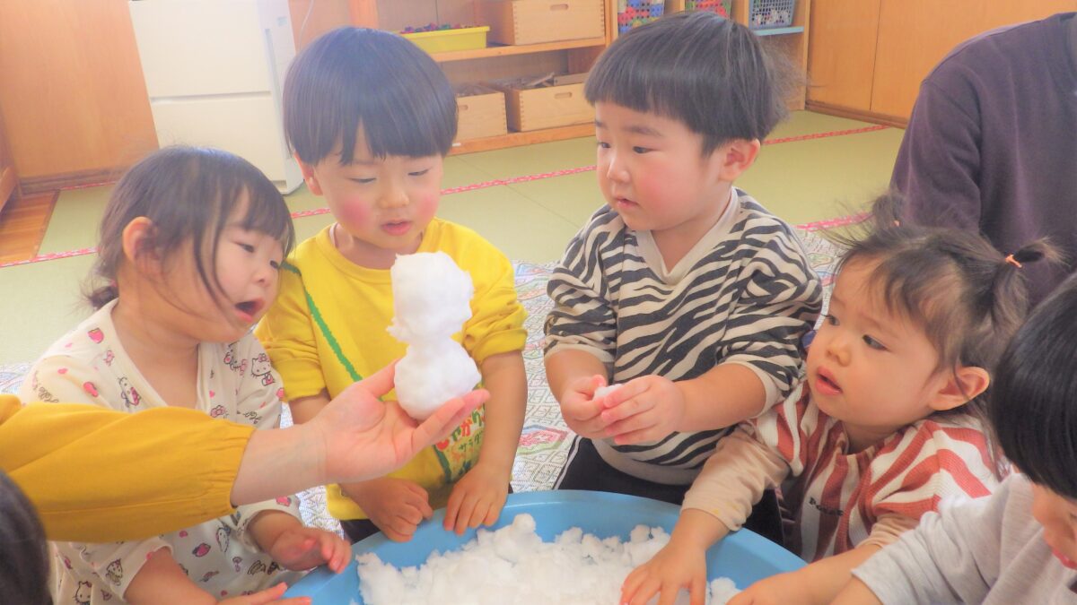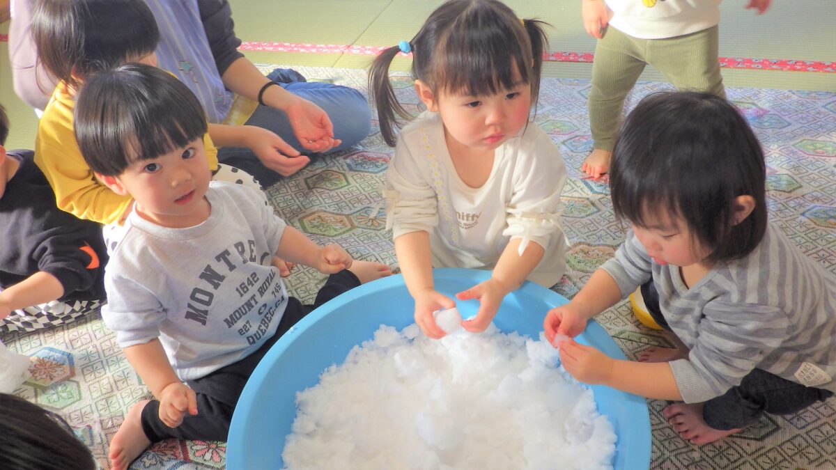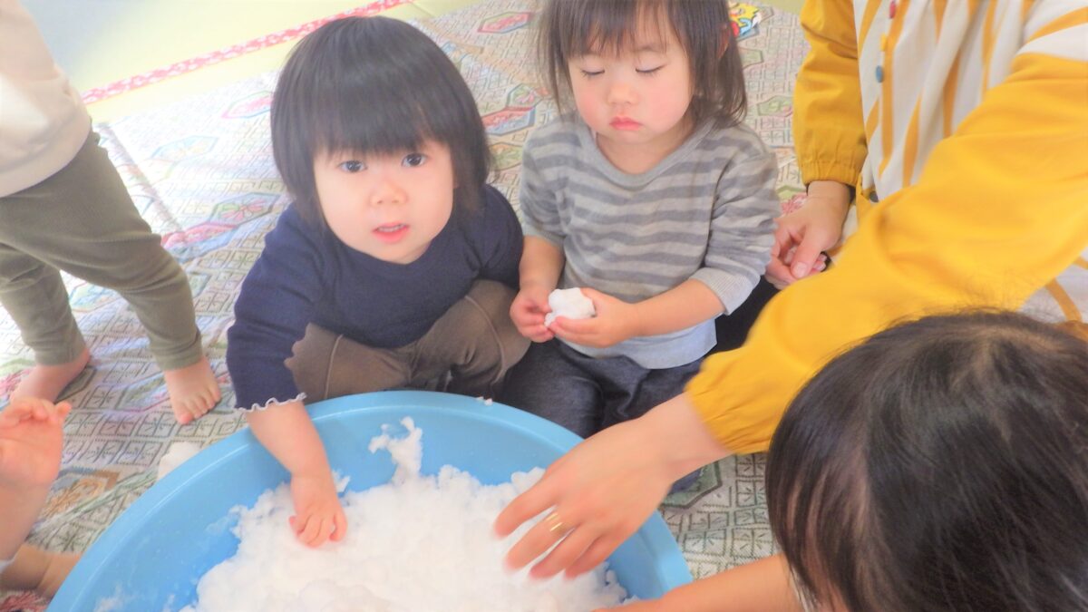 雪が大好きな子どもたち♡桶に雪を入れて、室内で雪の感触を楽しみました♪「冷たい!」と言いながら何度も触り、冷たい手を保育者につけて反応を楽しんだり、雪だるまを作ろうと雪を両手で丸めようとする姿も見られました。本格的な外での雪遊びが楽しみでしかたない様子のひよこ組でした♪