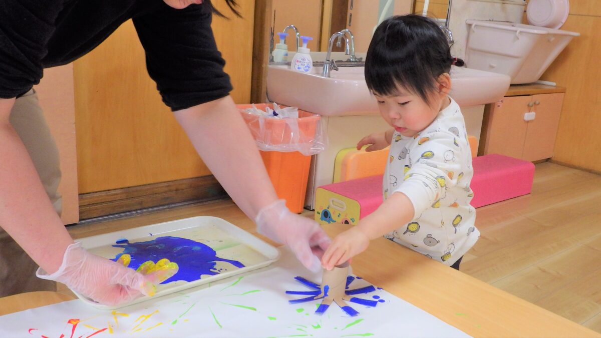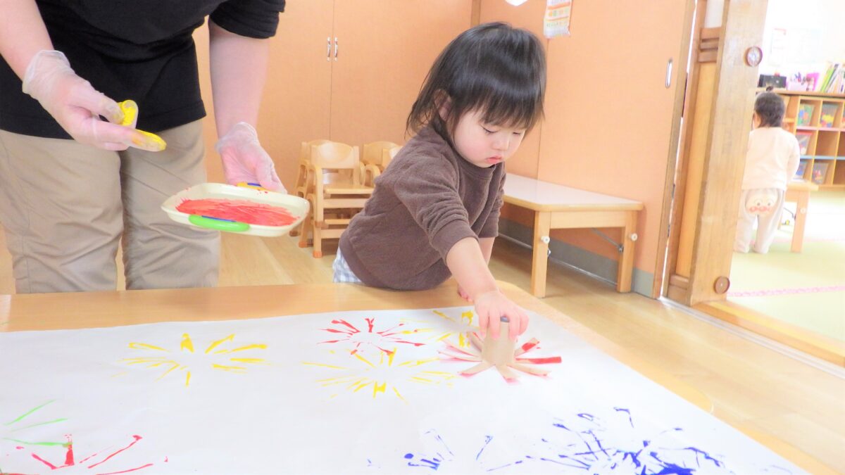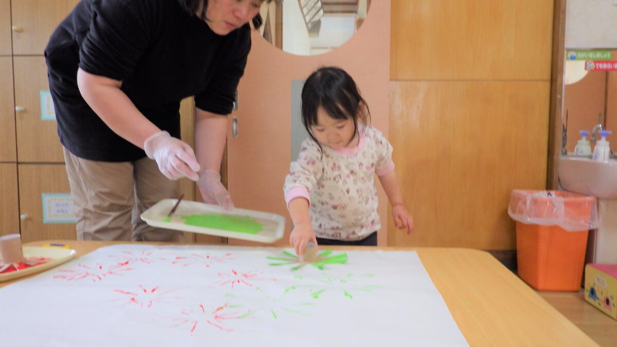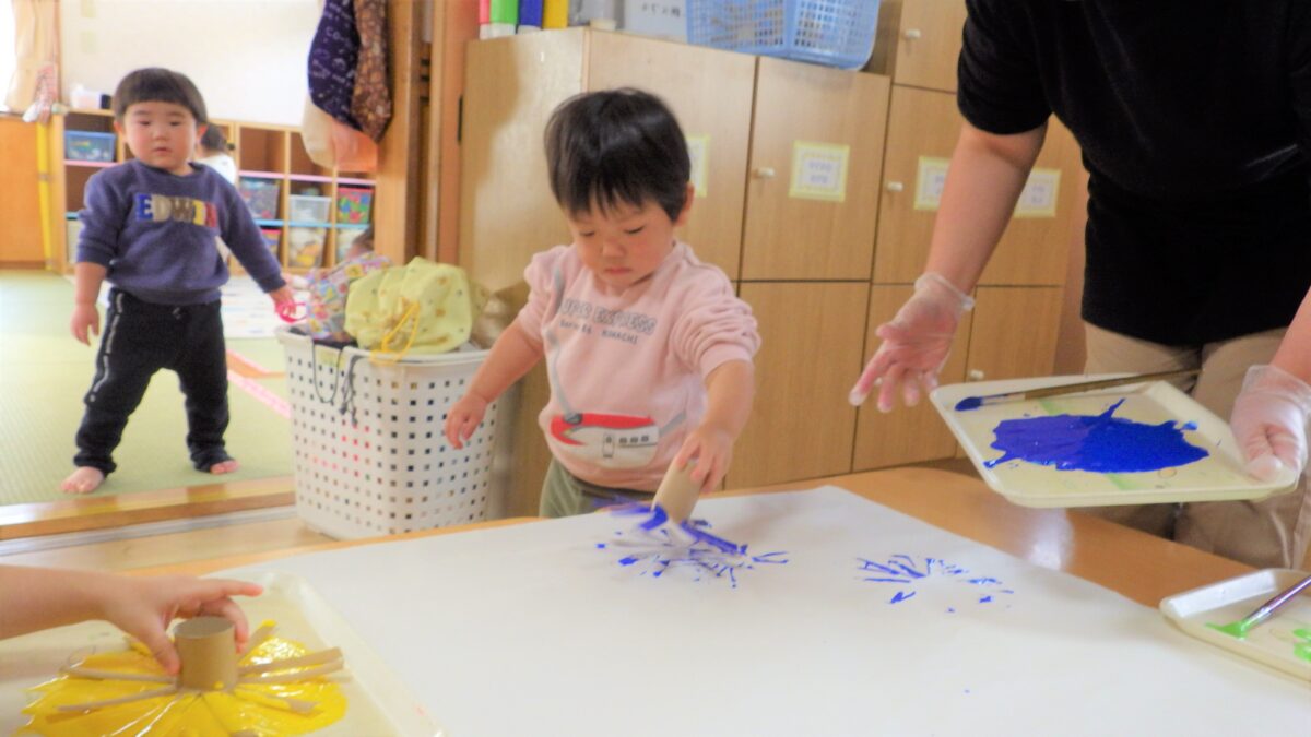 トイレットペーパーの芯で作ったスタンプを使って完成させた“くじびき屋さん”の看板作りから始まり、楽しみにしていたお店屋さんごっこ♡「きょうはお買い物だよ」と言うとやる気がみなぎっていました!感染症対策で、各クラスでのお買い物となりましたが、自分で一生懸命チケットを切って渡そうとしたり、月齢の低い子もやる気を持って参加していて、「ちょうだい」「ありがとう」が出来る子も多くいました。みんな全力で楽しんでいました♪