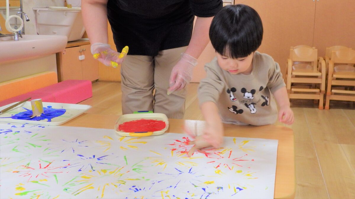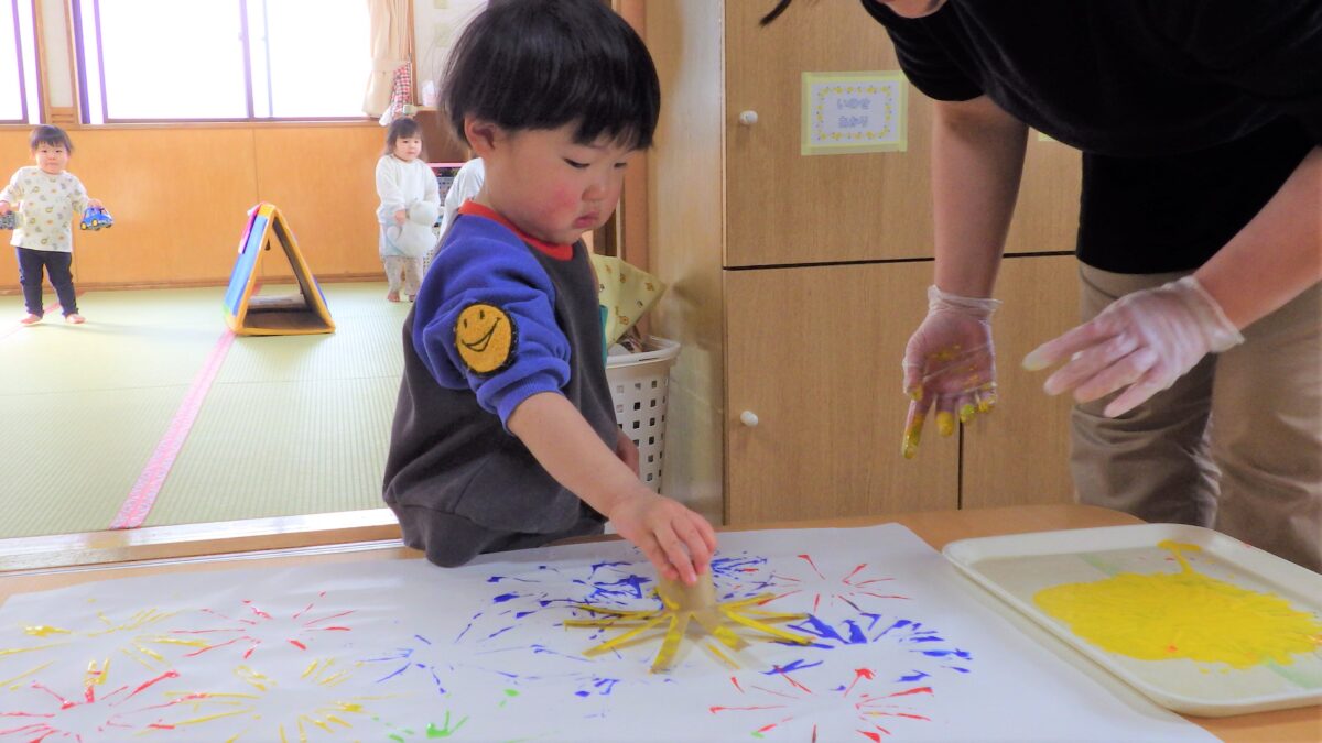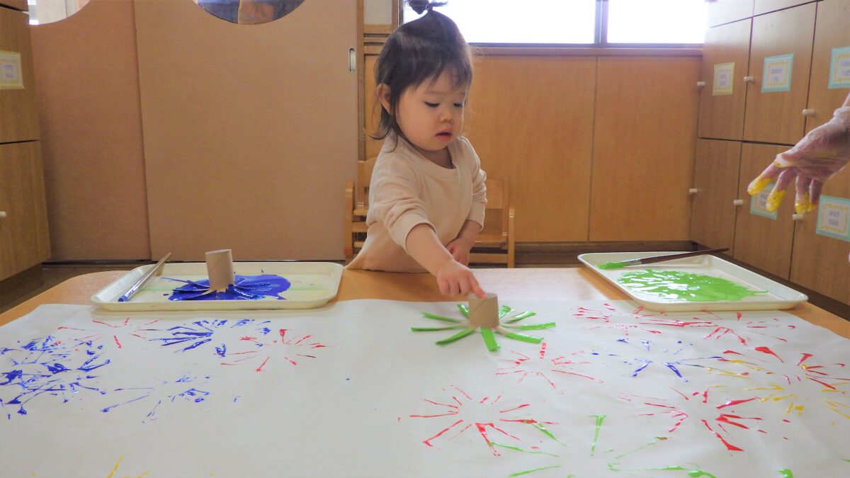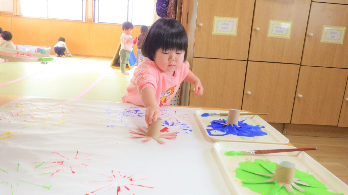 トイレットペーパーの芯で作ったスタンプを使って完成させた“くじびき屋さん”の看板作りから始まり、楽しみにしていたお店屋さんごっこ♡「きょうはお買い物だよ」と言うとやる気がみなぎっていました!感染症対策で、各クラスでのお買い物となりましたが、自分で一生懸命チケットを切って渡そうとしたり、月齢の低い子もやる気を持って参加していて、「ちょうだい」「ありがとう」が出来る子も多くいました。みんな全力で楽しんでいました♪