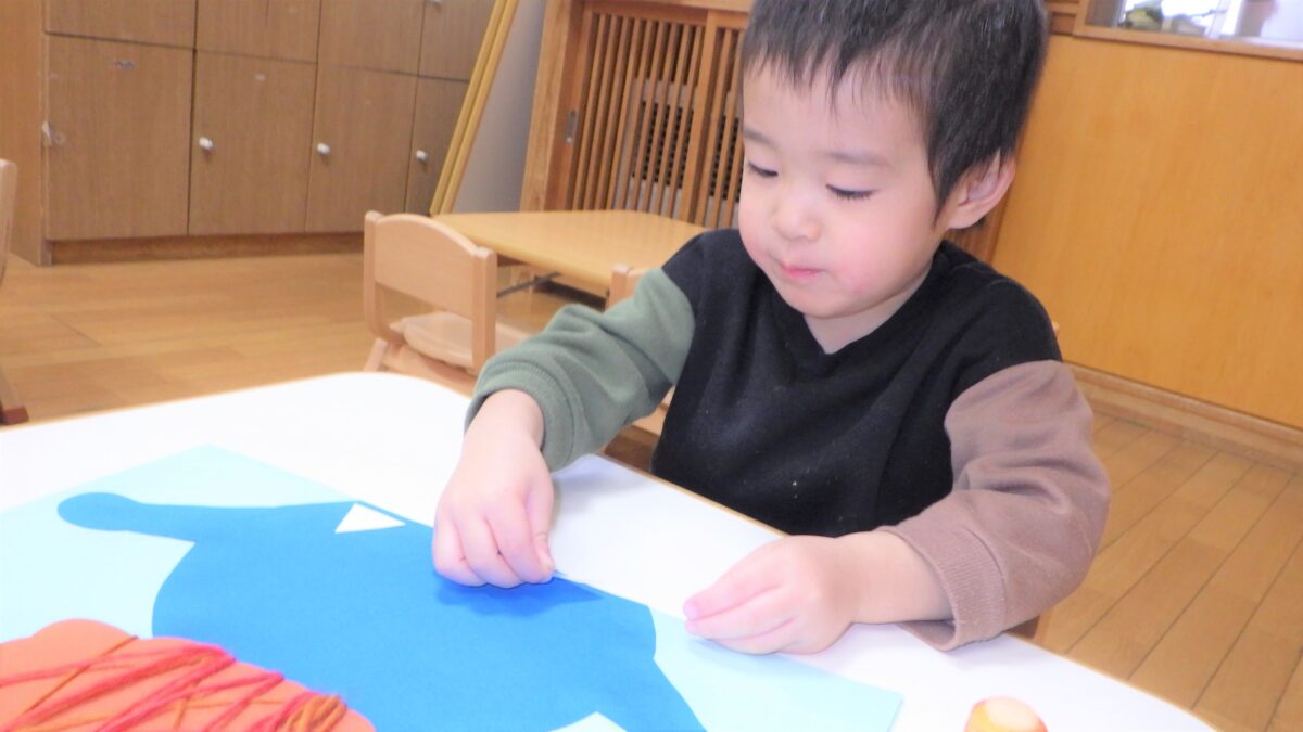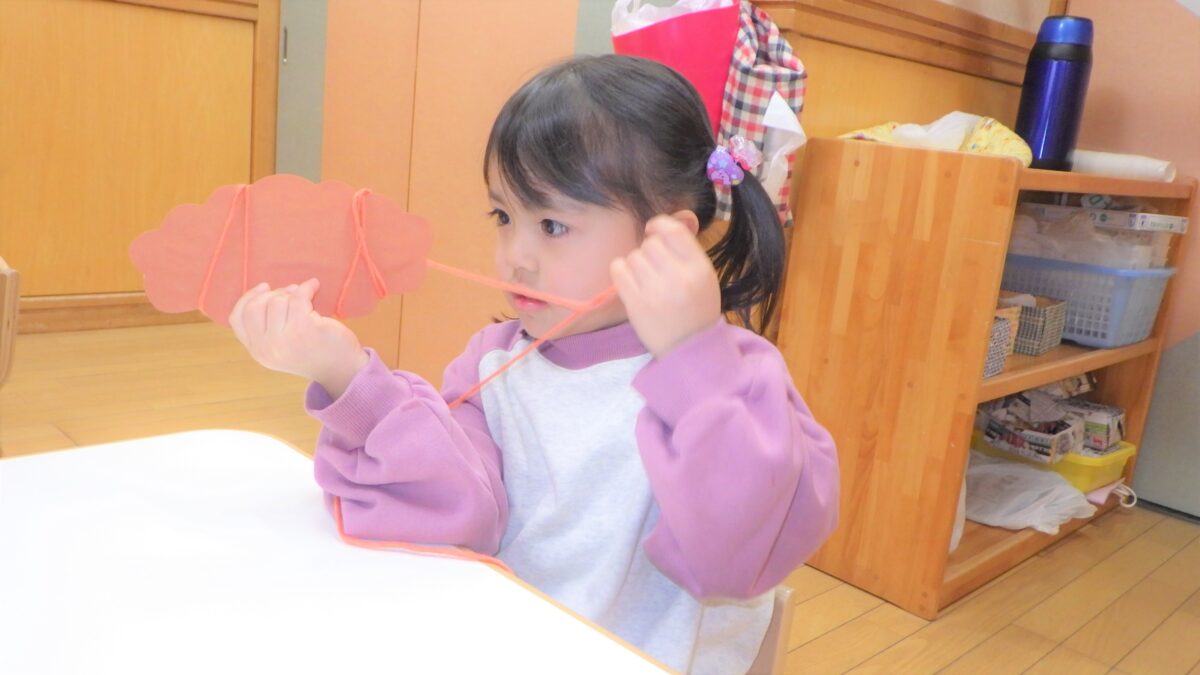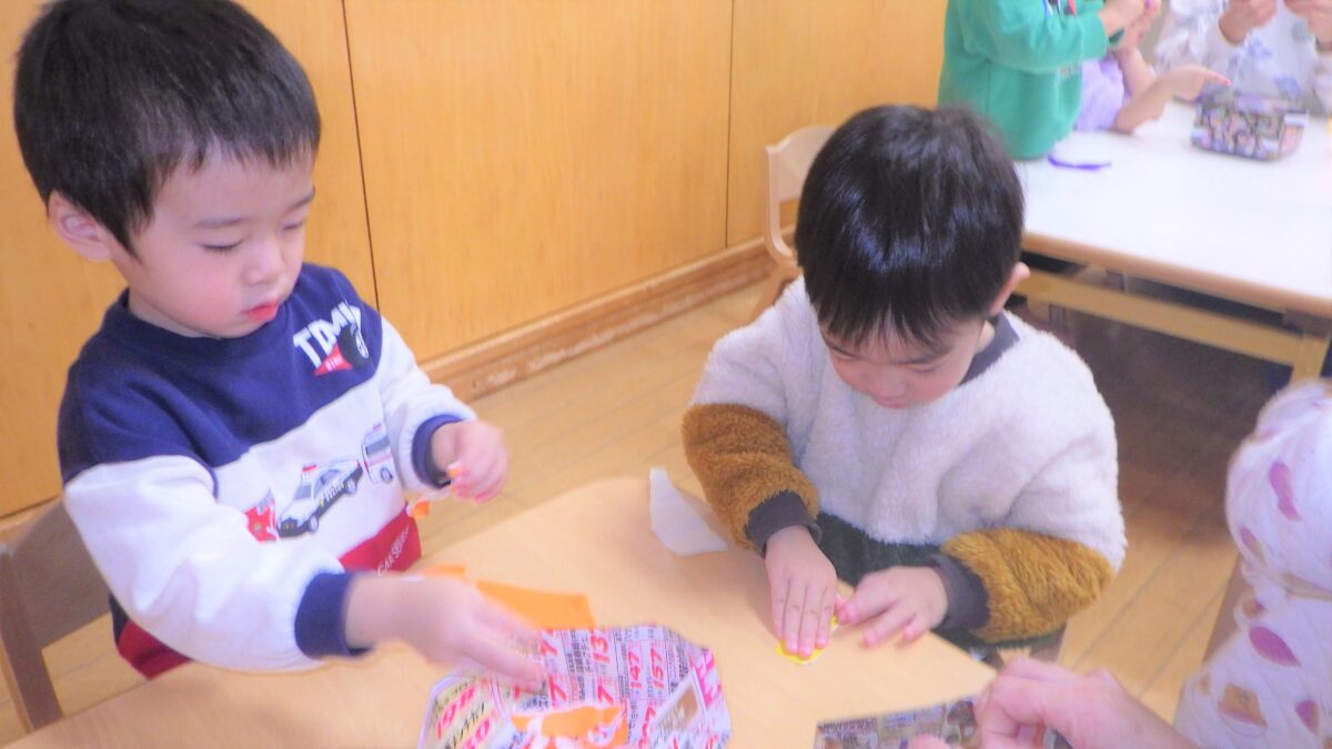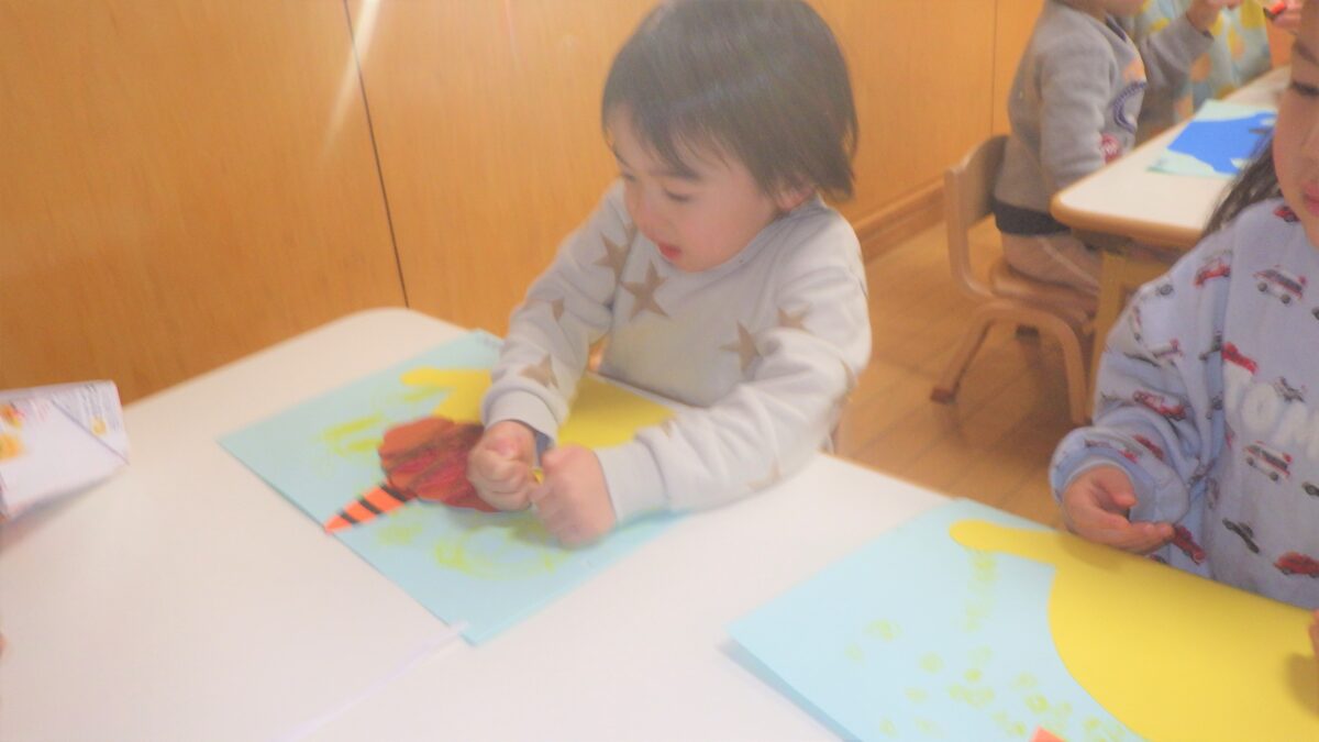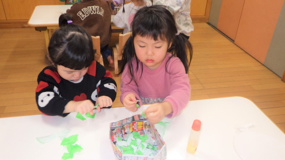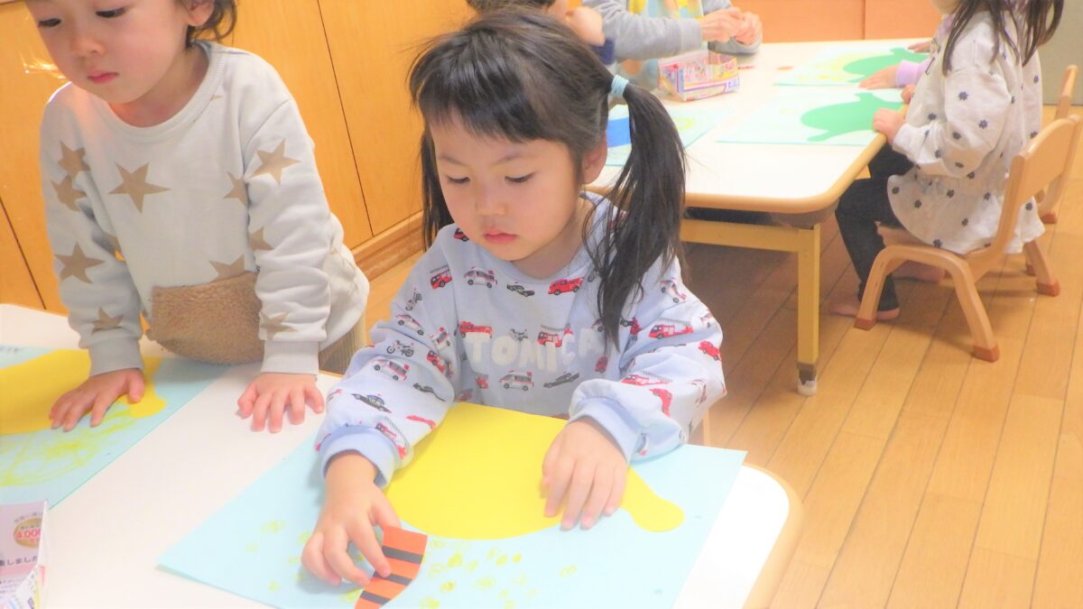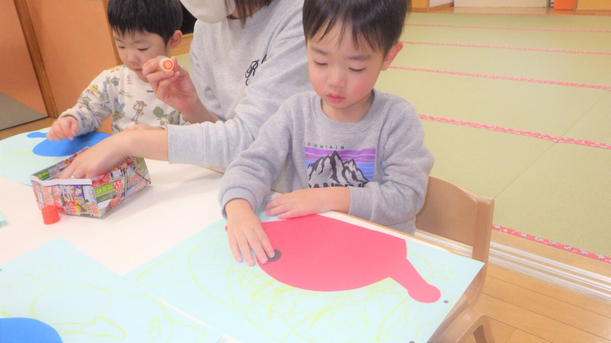 活動日記 DIARY 活動日記 🐿りす組1月 2026年1月31日 おみせやさんごっこに向けて看板作り。紙をちぎって貼ったり、お花紙にのりをつけてペタペタ貼ったり…お花紙が手にくっついて大苦戦💦でもかわいい看板ができました💕 「雪だぁ!」寒さになんか負けないぞ!冬のあそびを満喫中🤗 もうすぐ節分👹みんなの鬼はどんな鬼かな⁉毛糸を巻き巻き…鬼の髪の毛作り!大好きな「あかたろう」の絵本の中から赤・青・黄・緑の色を選び、自分の鬼の色を決めました。鬼退治がんばるぞ~✊ 新しい記事へ古い記事へ 活動日記一覧に戻る