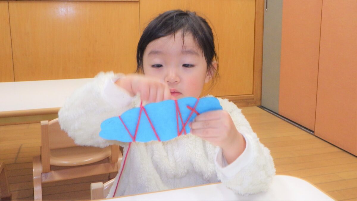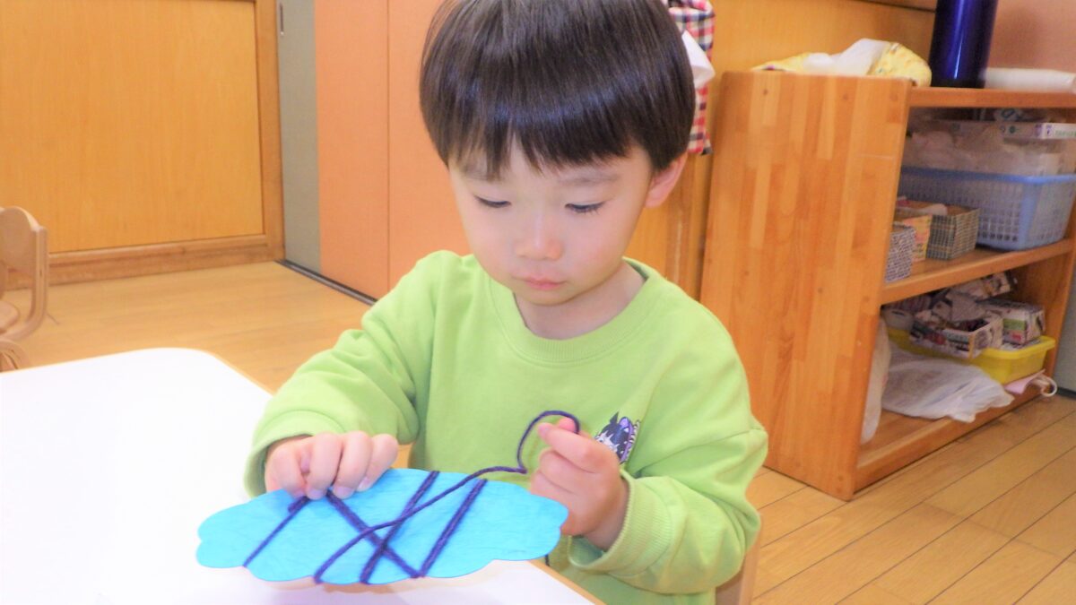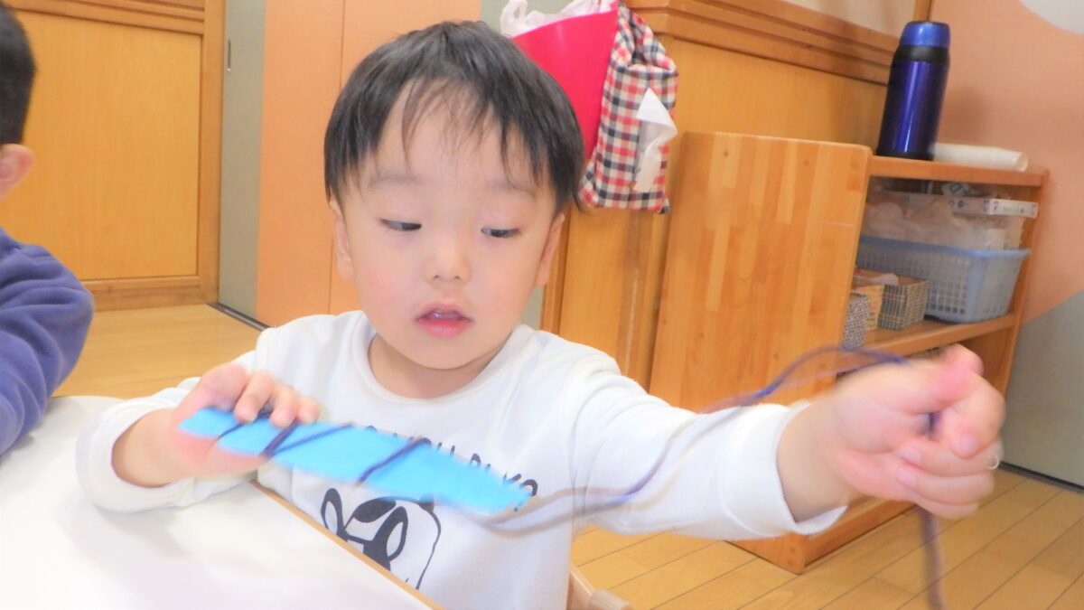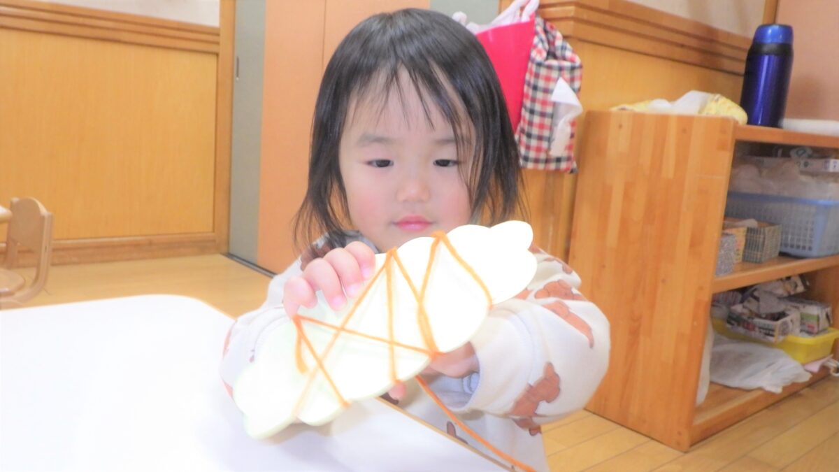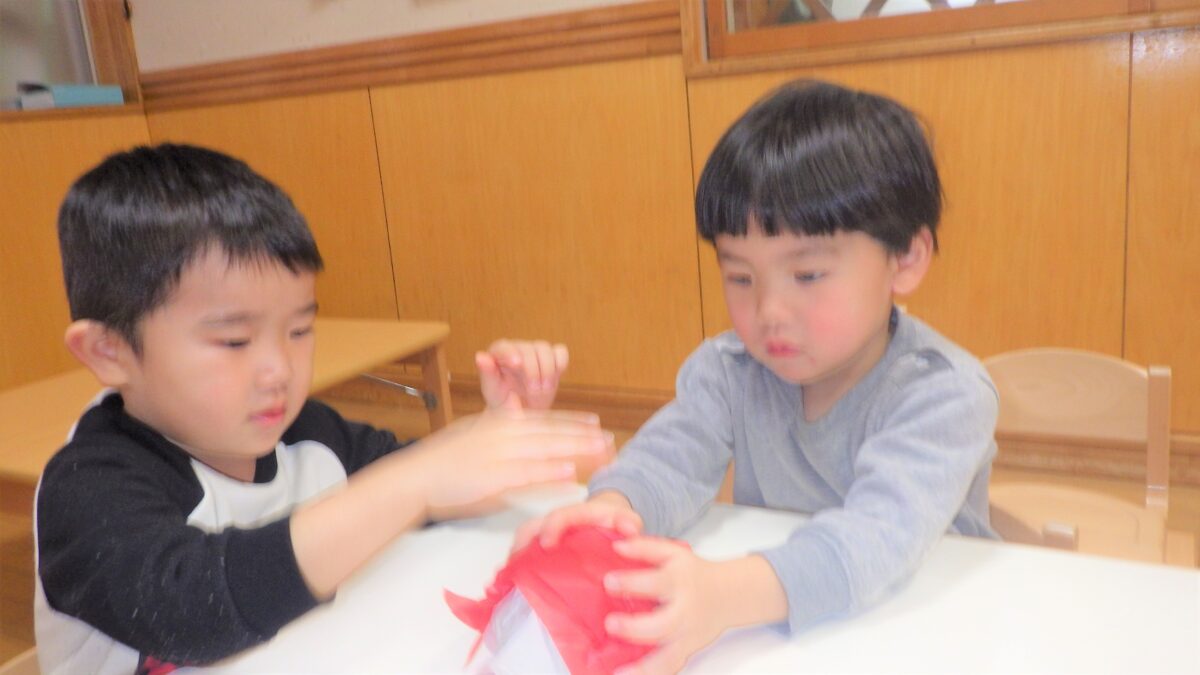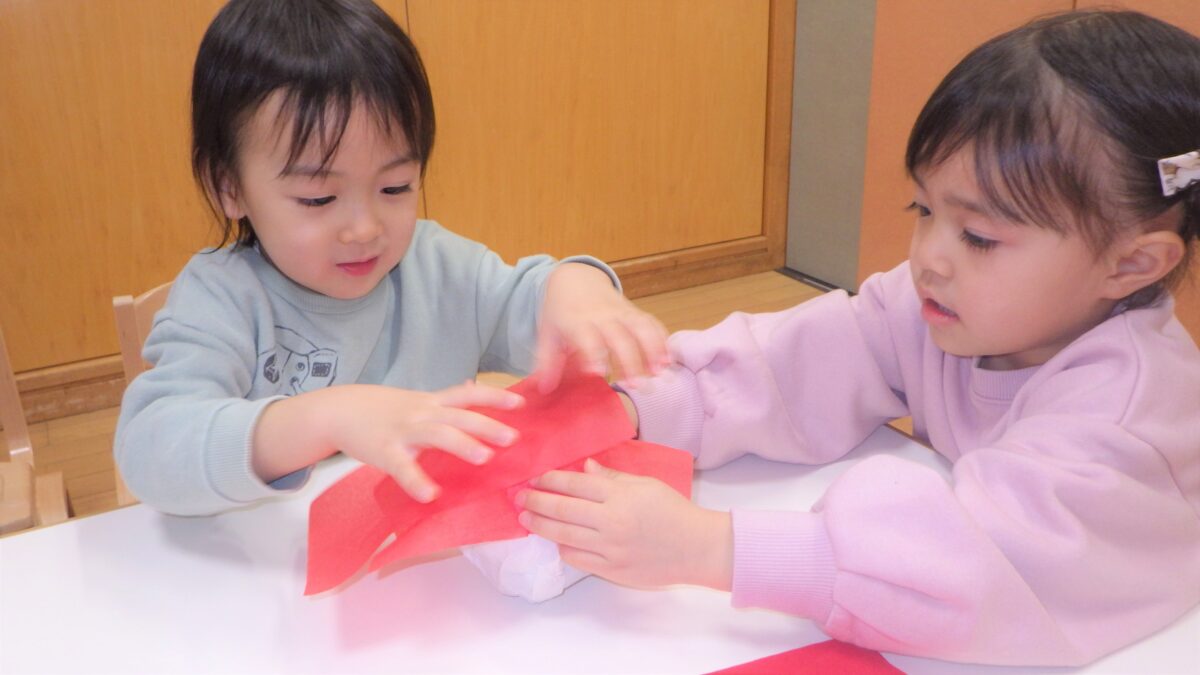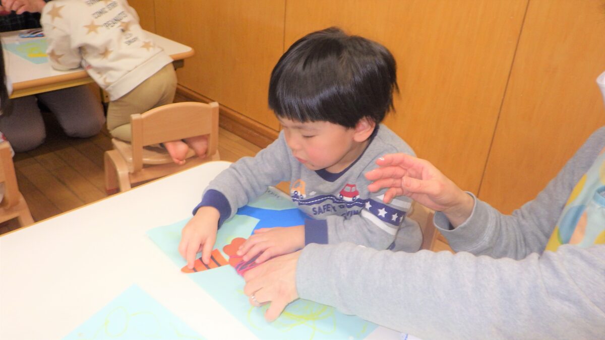 活動日記 DIARY 活動日記 🐿りす組1月 2026年1月31日 おみせやさんごっこに向けて看板作り。紙をちぎって貼ったり、お花紙にのりをつけてペタペタ貼ったり…お花紙が手にくっついて大苦戦💦でもかわいい看板ができました💕 「雪だぁ!」寒さになんか負けないぞ!冬のあそびを満喫中🤗 もうすぐ節分👹みんなの鬼はどんな鬼かな⁉毛糸を巻き巻き…鬼の髪の毛作り!大好きな「あかたろう」の絵本の中から赤・青・黄・緑の色を選び、自分の鬼の色を決めました。鬼退治がんばるぞ~✊ 新しい記事へ古い記事へ 活動日記一覧に戻る