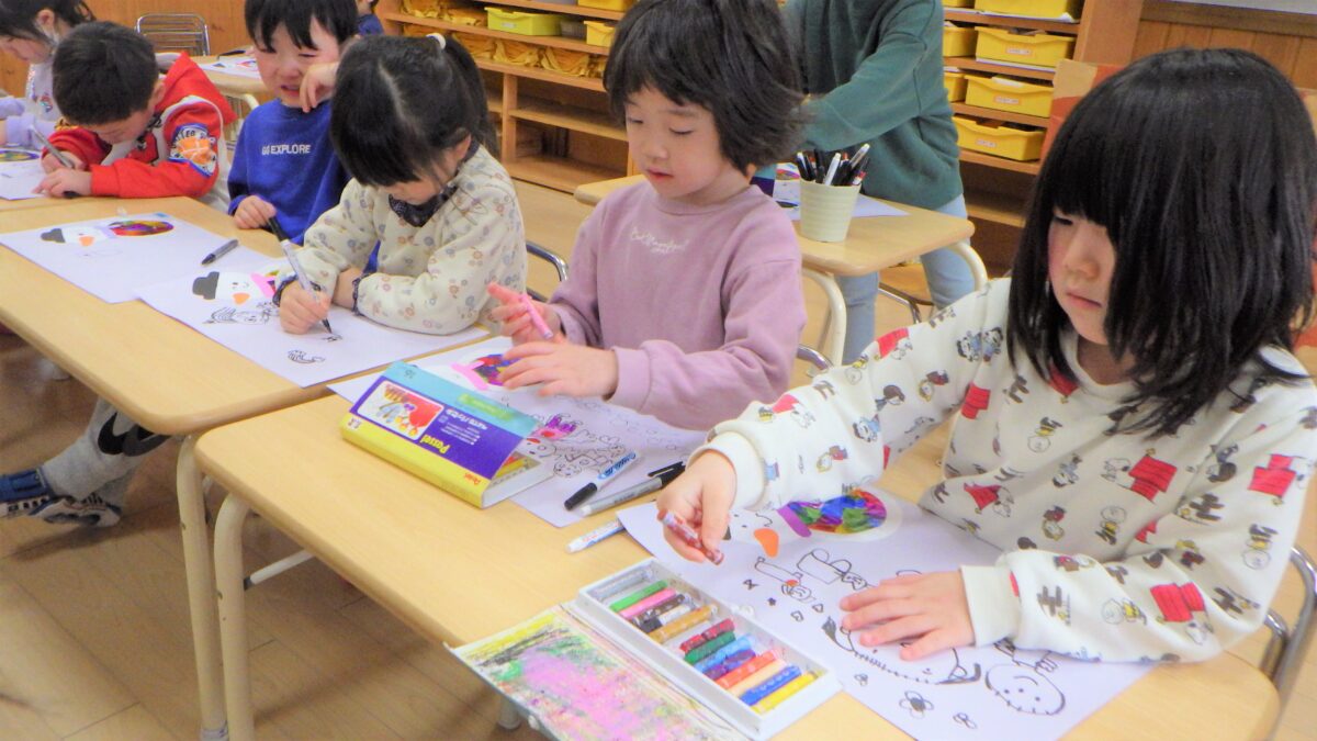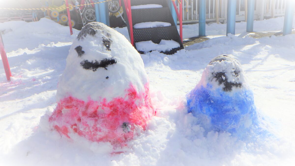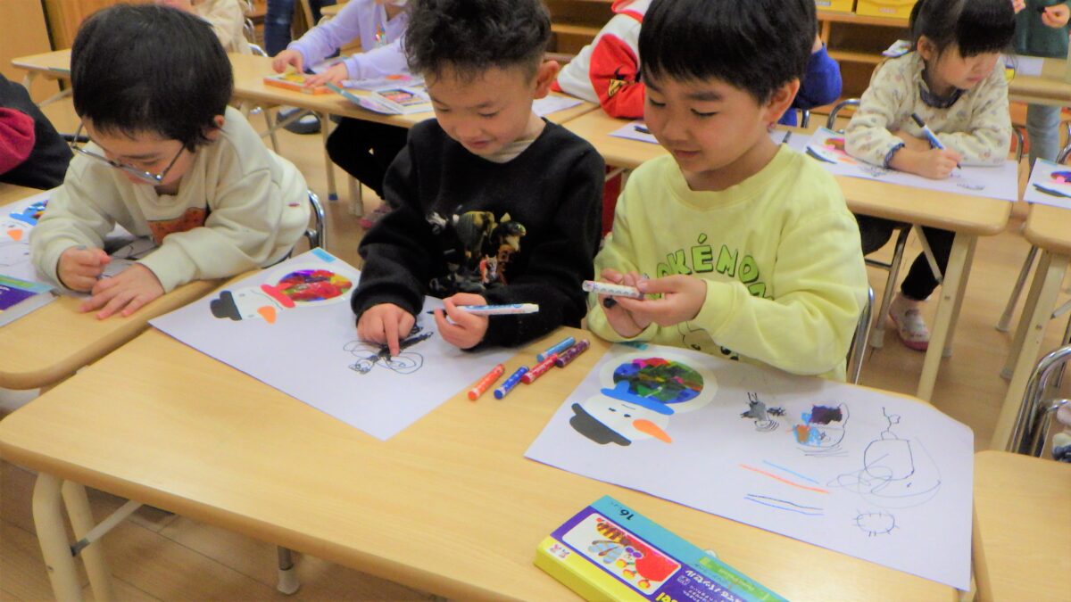 以前製作した雪だるまを画用紙に貼って、「雪ダルマと遊ぼう」のテーマで絵を描きました⛄