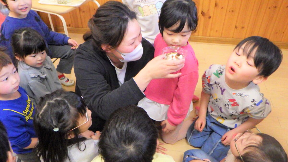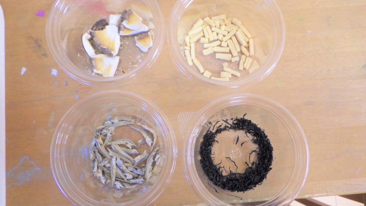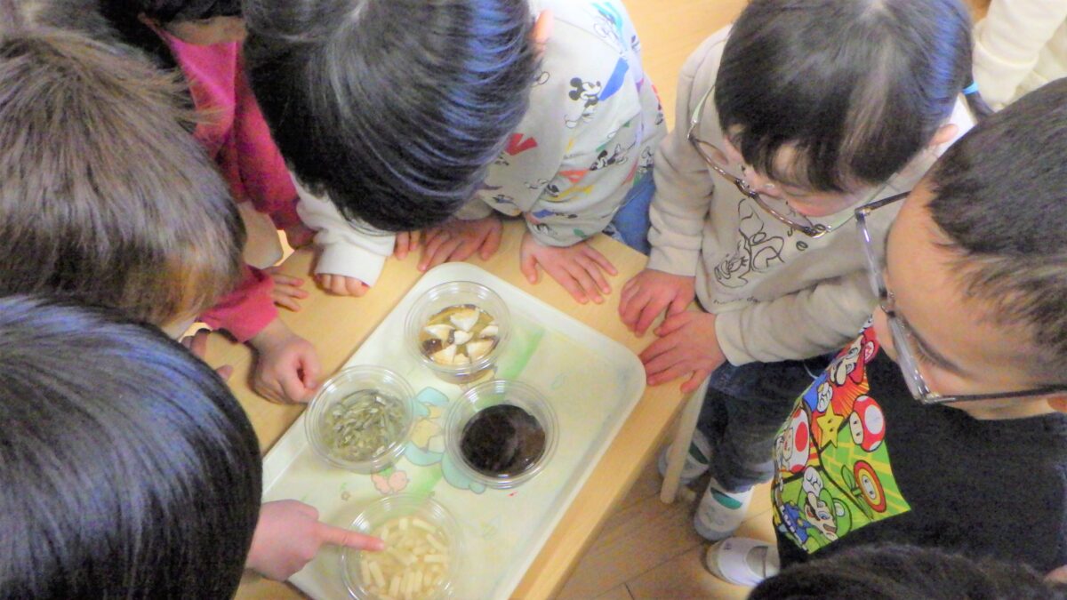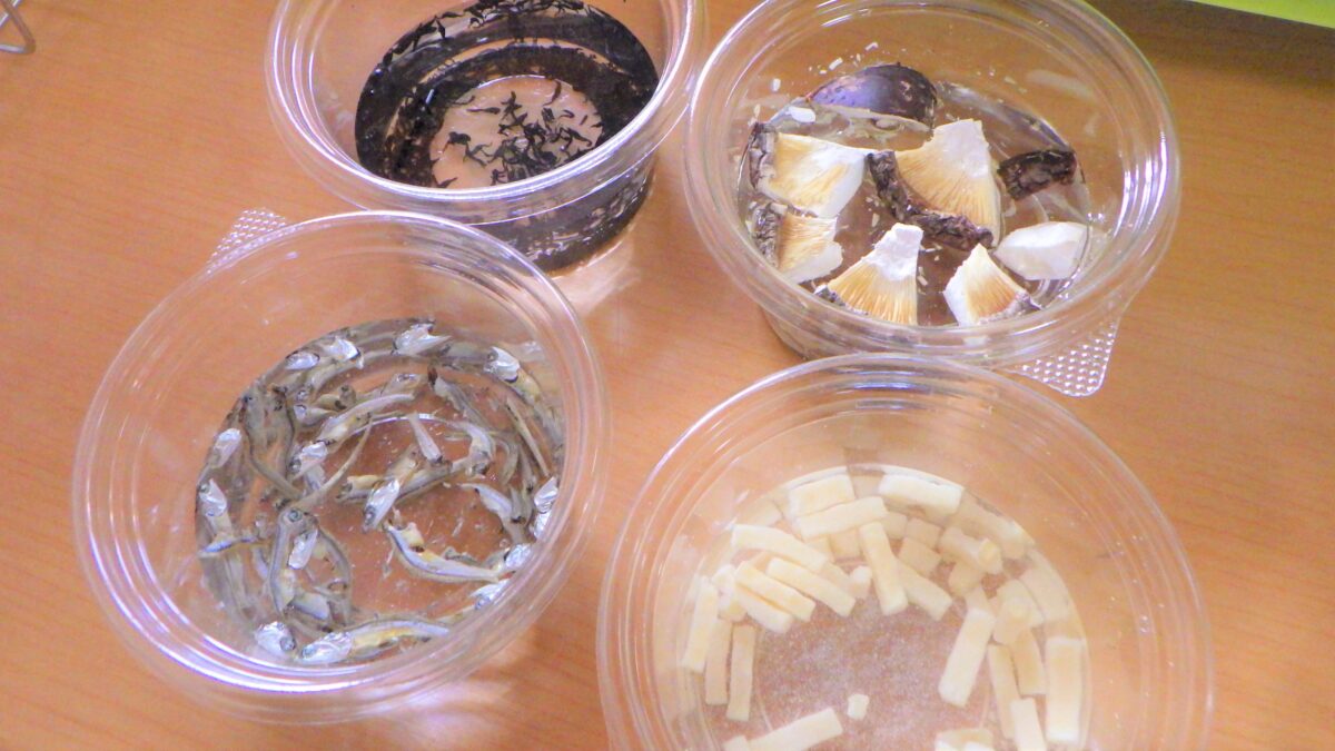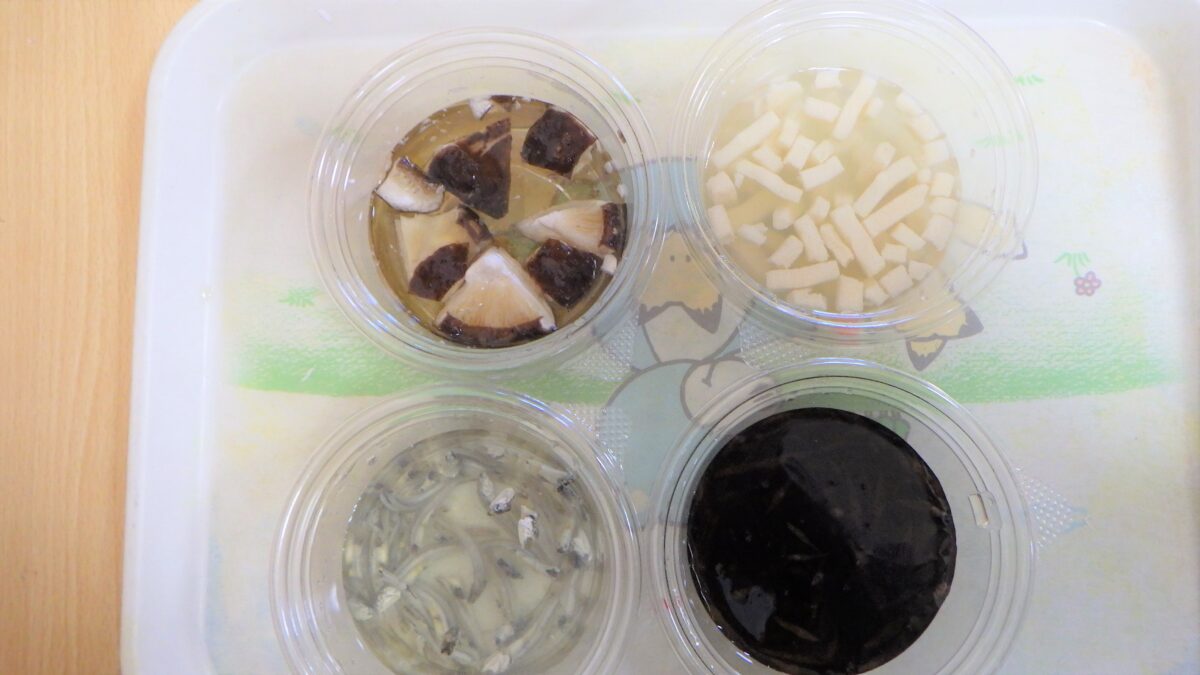 “しいたけ”“にぼし”“高野豆腐”“ひじき”水に浸す前と後の変化を見て、触れて、嗅いで様々な角度から観察しました。それぞれ感じたところを発表してもらいました。「こうやって水に戻してから、調理すること」を伝えると驚いていました。とても貴重な体験となりました。
