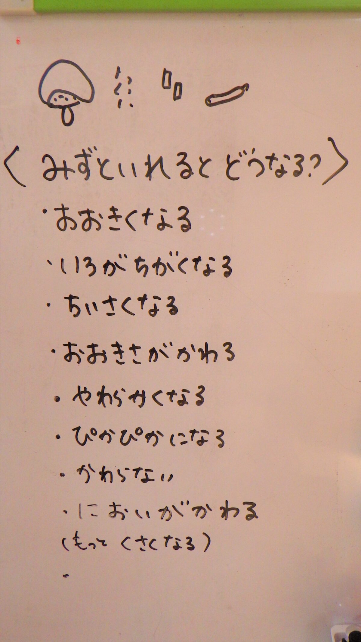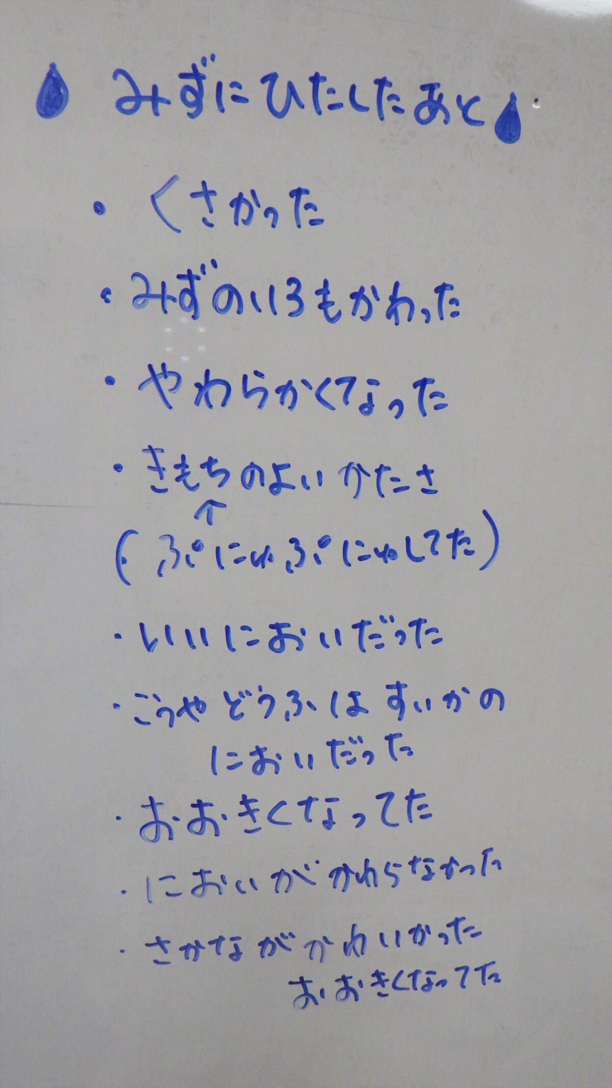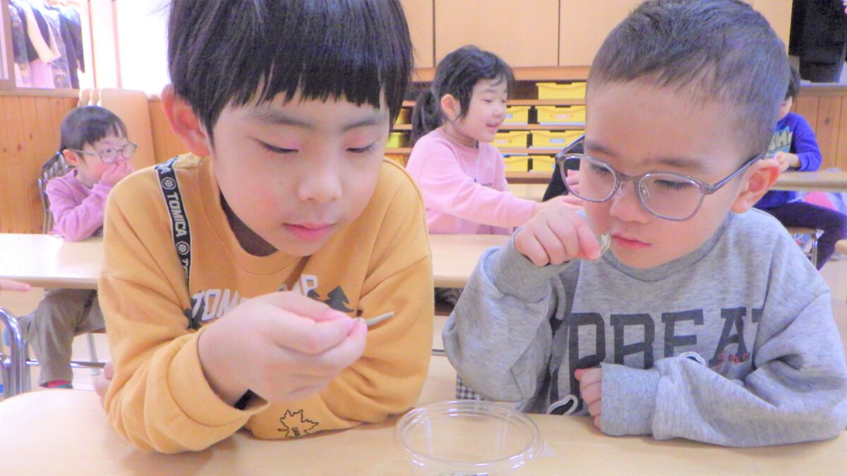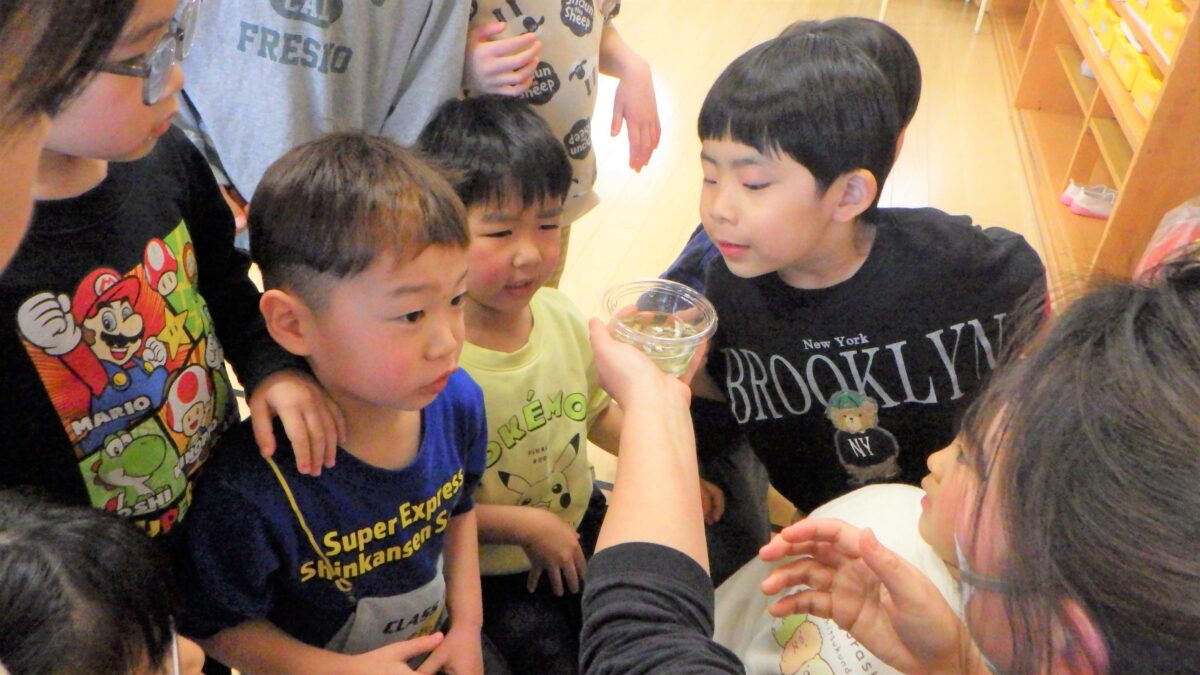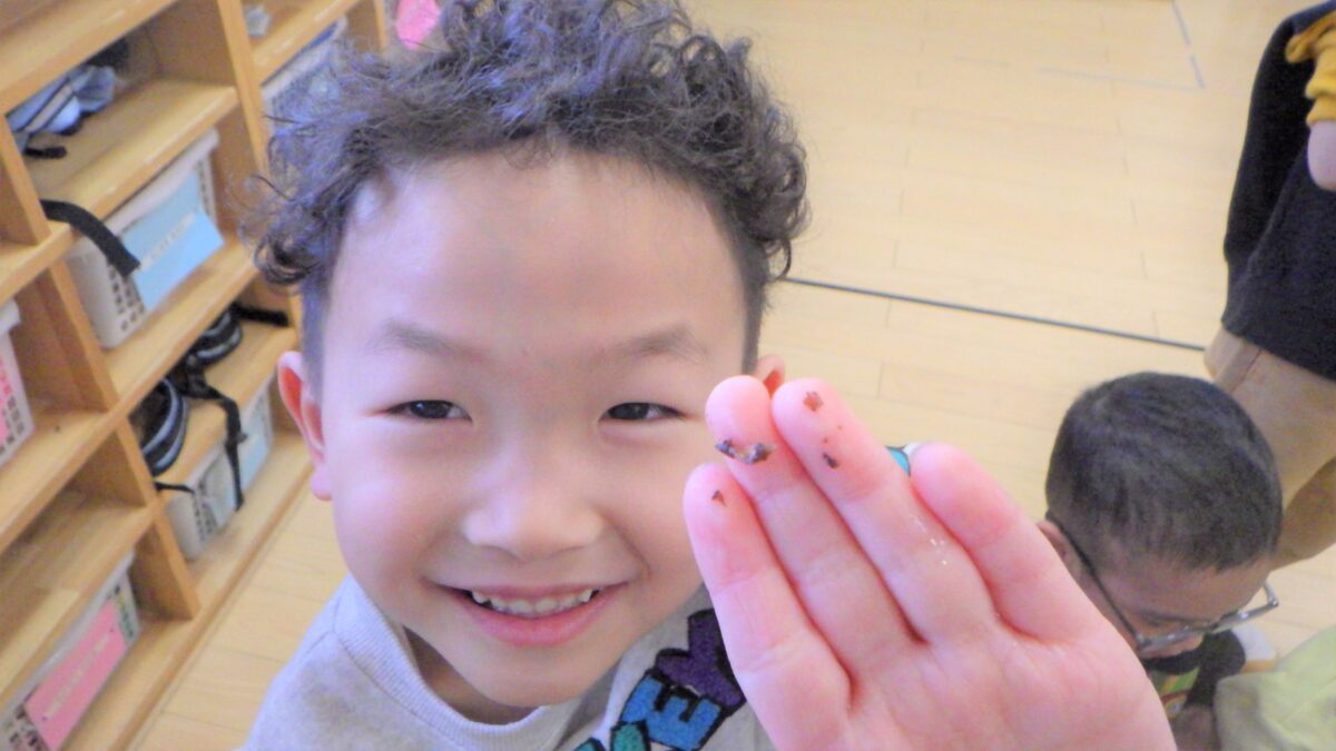 “しいたけ”“にぼし”“高野豆腐”“ひじき”水に浸す前と後の変化を見て、触れて、嗅いで様々な角度から観察しました。それぞれ感じたところを発表してもらいました。「こうやって水に戻してから、調理すること」を伝えると驚いていました。とても貴重な体験となりました。