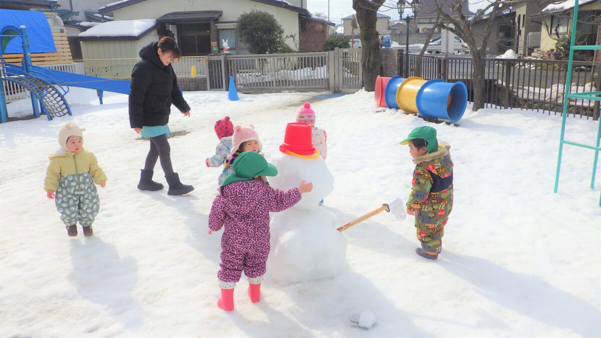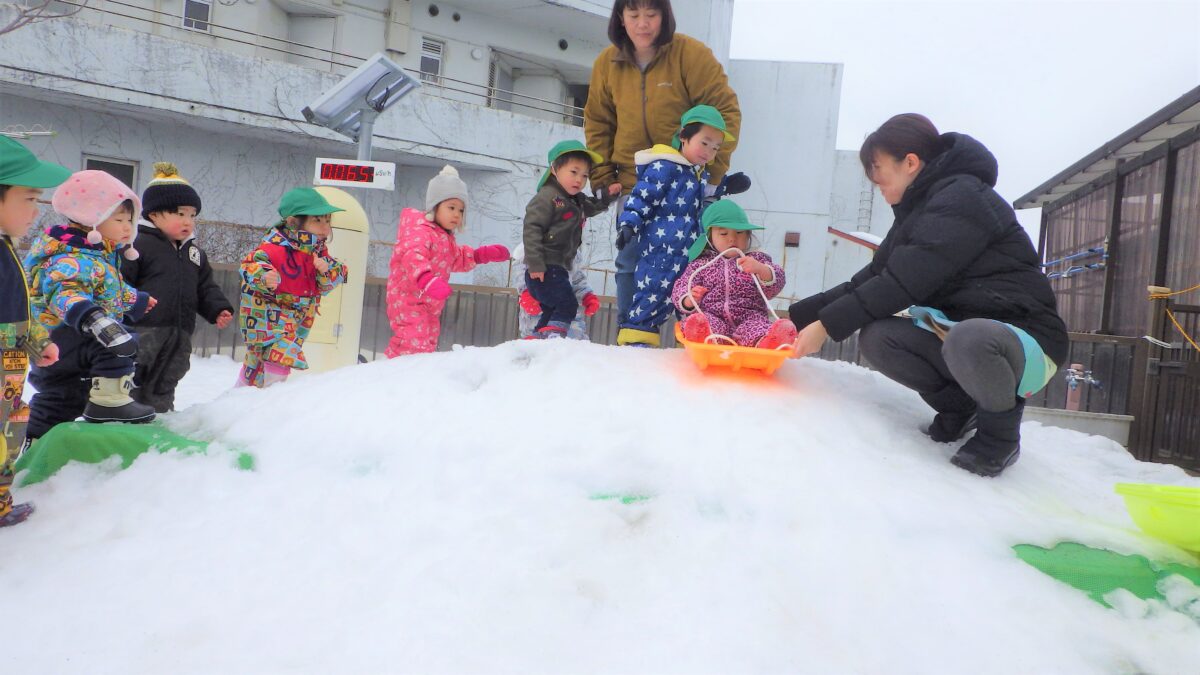 念願の雪遊び!触ったり踏みつけたり、少し固くなりつつある雪でしたが、子どもたちはとても嬉しそうに遊んでいました!そりにも挑戦し、初めてだった子もたくさんいたようですが、一度乗ったら病みつきになって、何度も何度も滑っては大笑いでした!