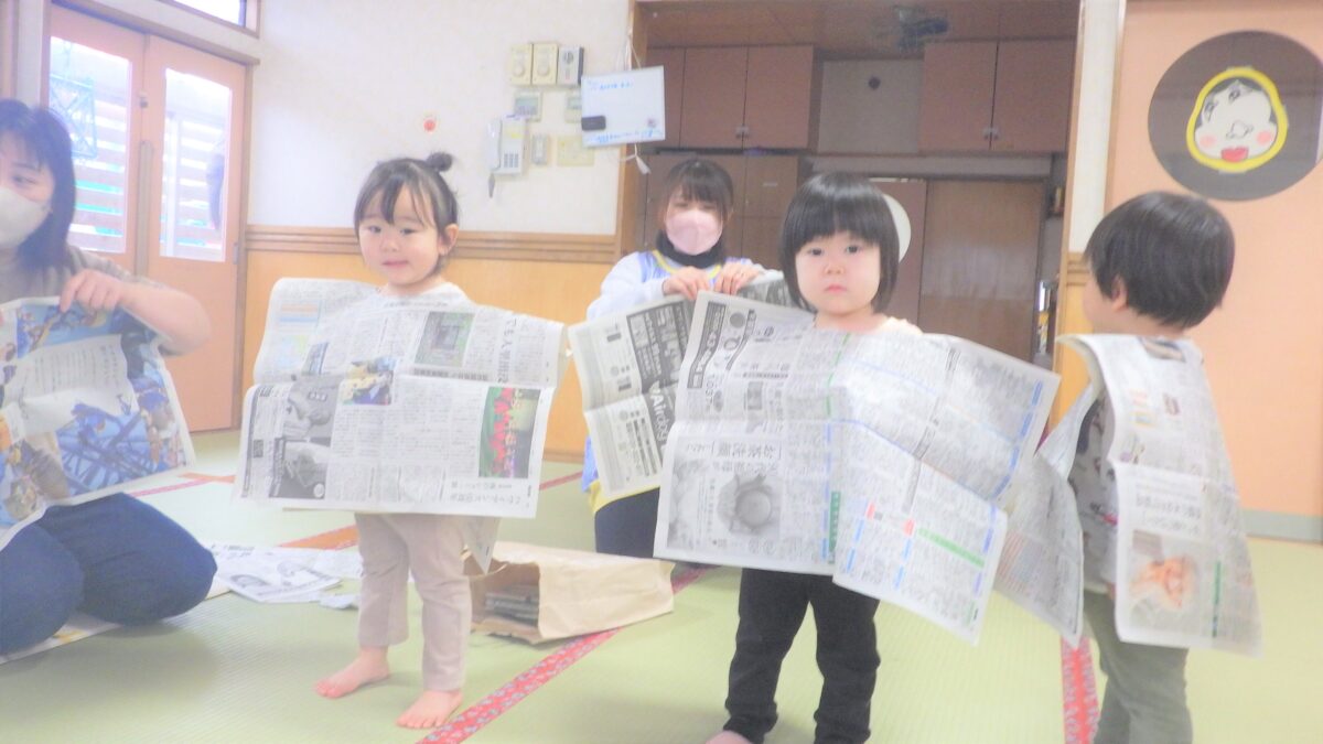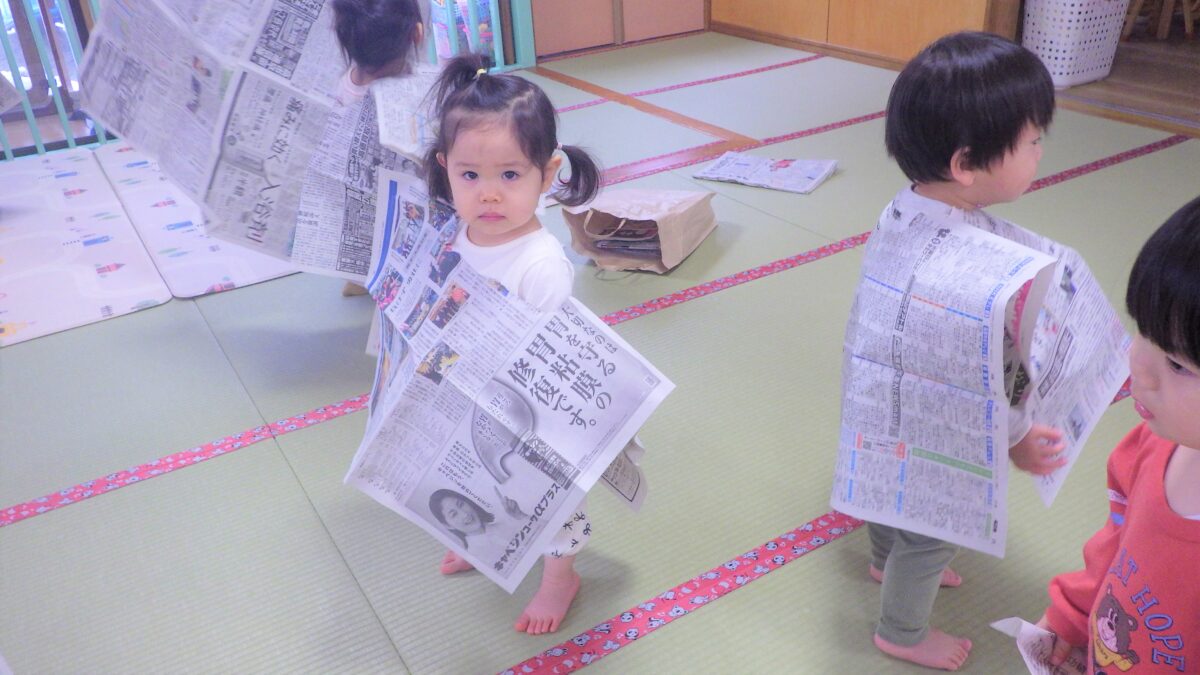 新聞紙で洋服を作って見せ合いっこです!ヒーローになりきり、とても強くなった気持ちで、自信満々の顔がかわいらしいですね!