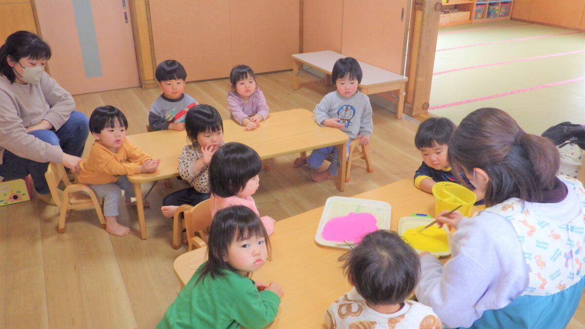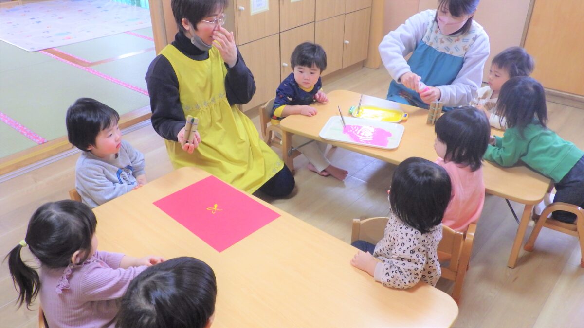 ひな祭りの製作は、スタンプと顔のお絵かきに挑戦しました!本物の雛飾りを見てから、初めての顔描きスタート!…「おめめは二つ、お口は一つ…」と保育者が呪文のように唱えながら一人ひとり丁寧に描き上げました。クラスにも飾ってありますので、ぜひ見てくださいね!