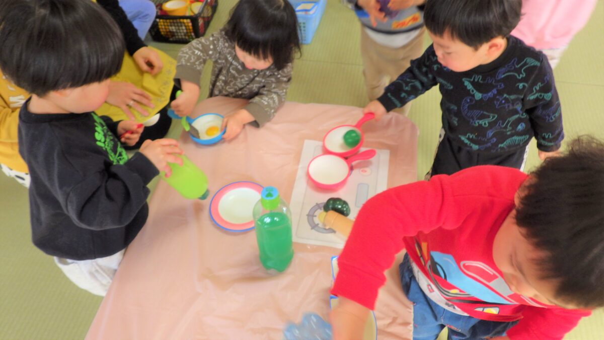 クラスでのままごとにも急展開が!今まではお皿にご飯を乗せるだけだったのが、フライパンを使って調理するところから出来るようになりました💛ジュースを注いで、ご飯を作って、並べて…パーティーのように大盛り上がりでした!