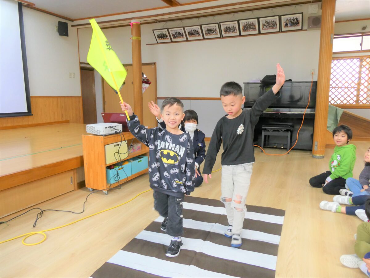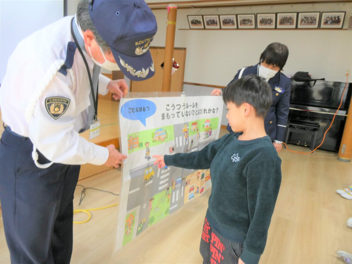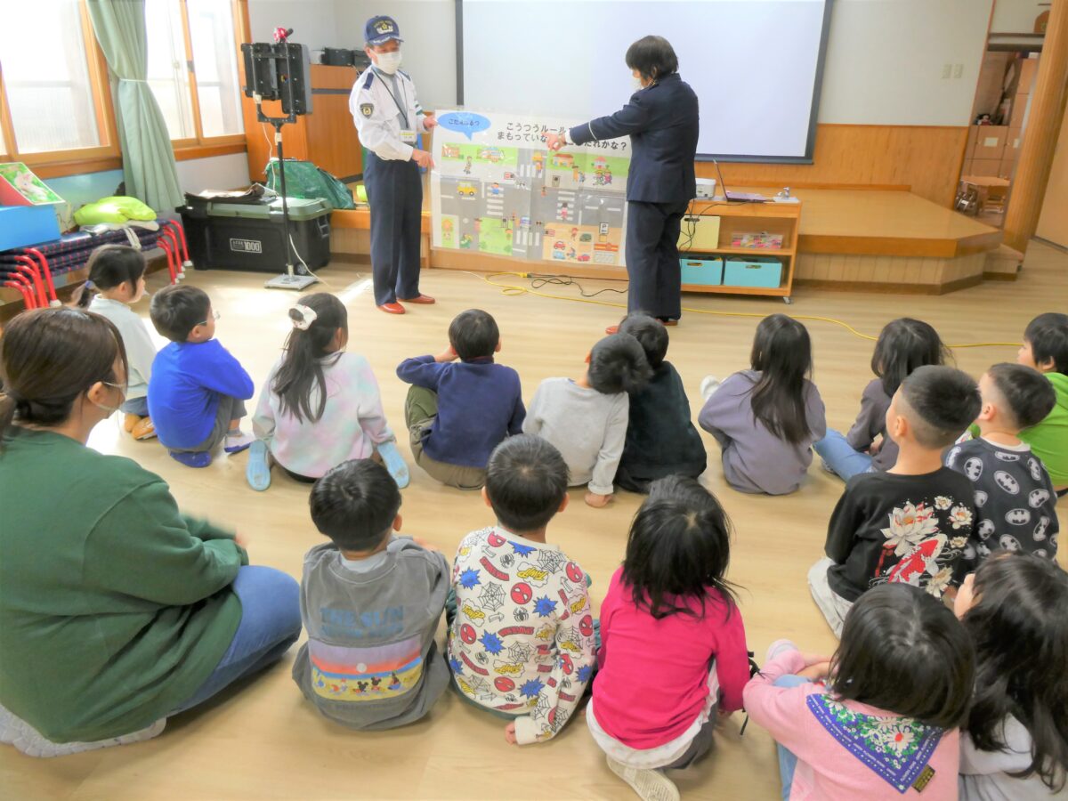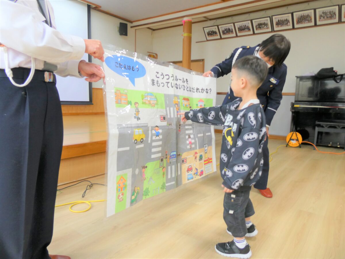 交通安全のDVDでは、道路や駐車場などに潜む危険性や、車は急に止まれないことを学びました。質問や問いかけにきちんと答え、指導員さんの話を真剣に聞いていました。学校へ行く前に話を聞くことができてよかったです。