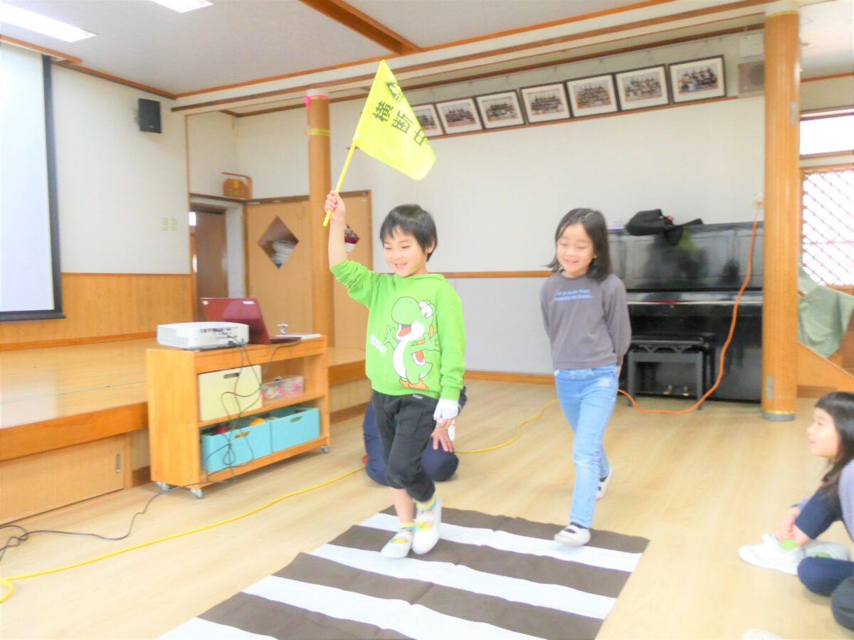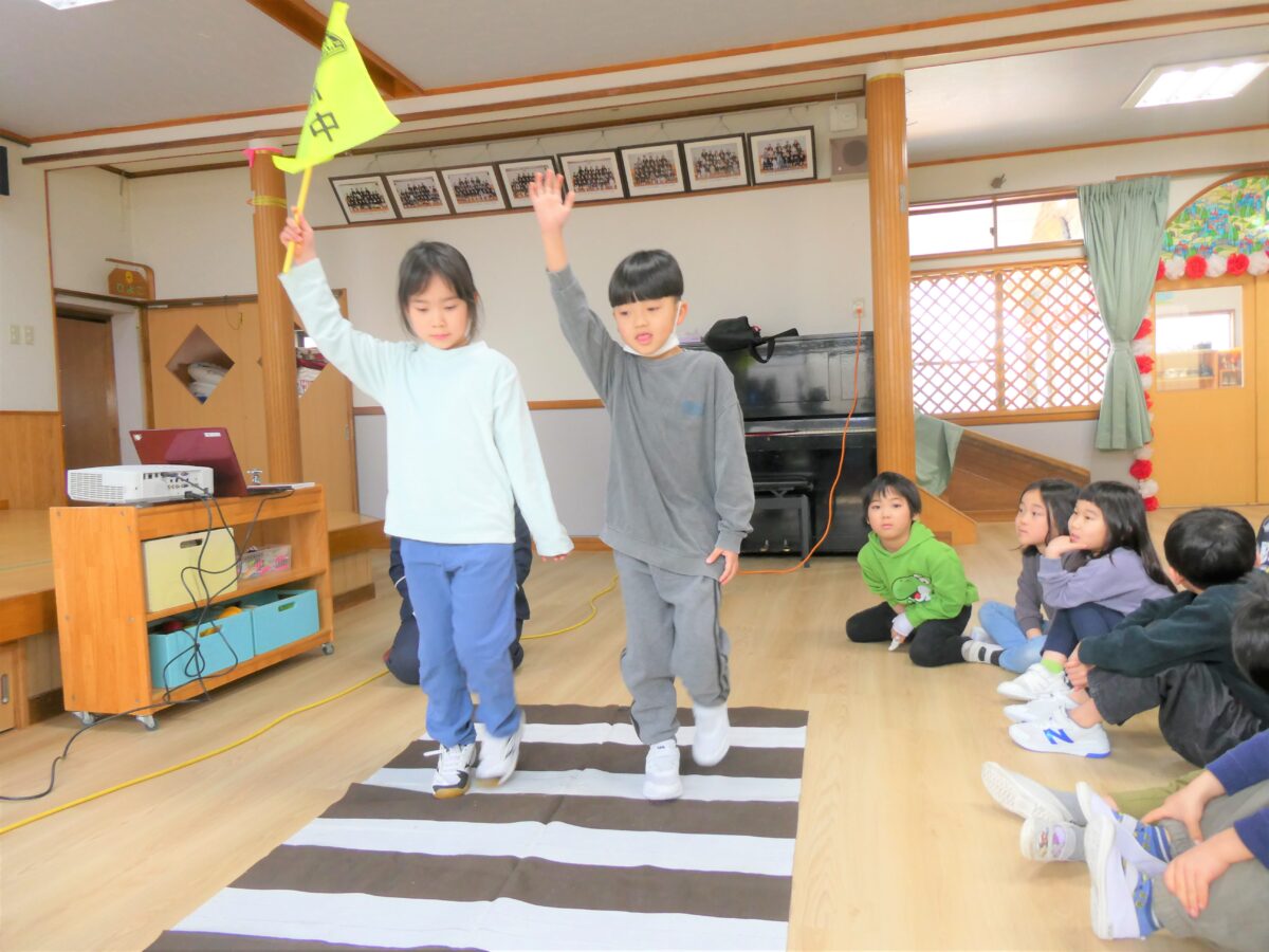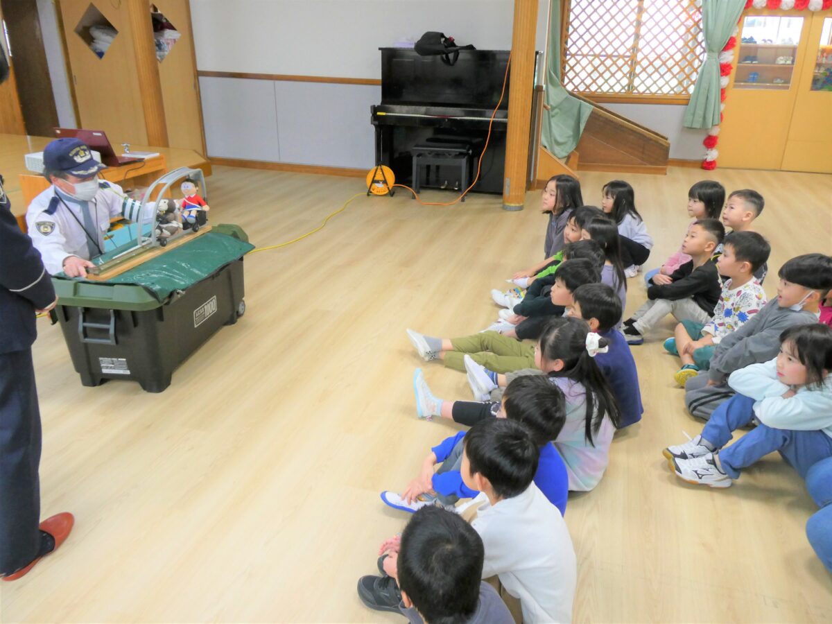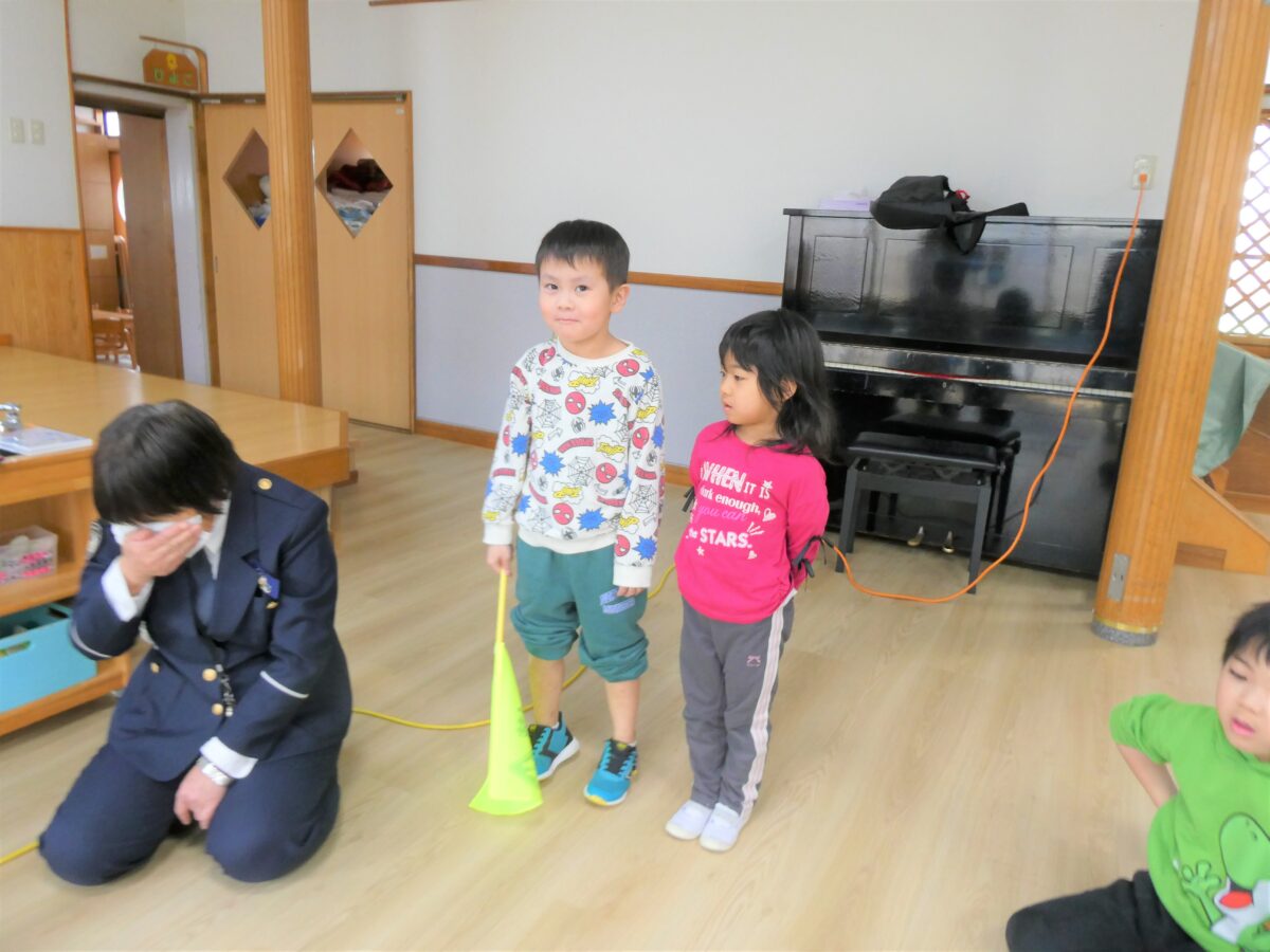 交通安全のDVDでは、道路や駐車場などに潜む危険性や、車は急に止まれないことを学びました。質問や問いかけにきちんと答え、指導員さんの話を真剣に聞いていました。学校へ行く前に話を聞くことができてよかったです。