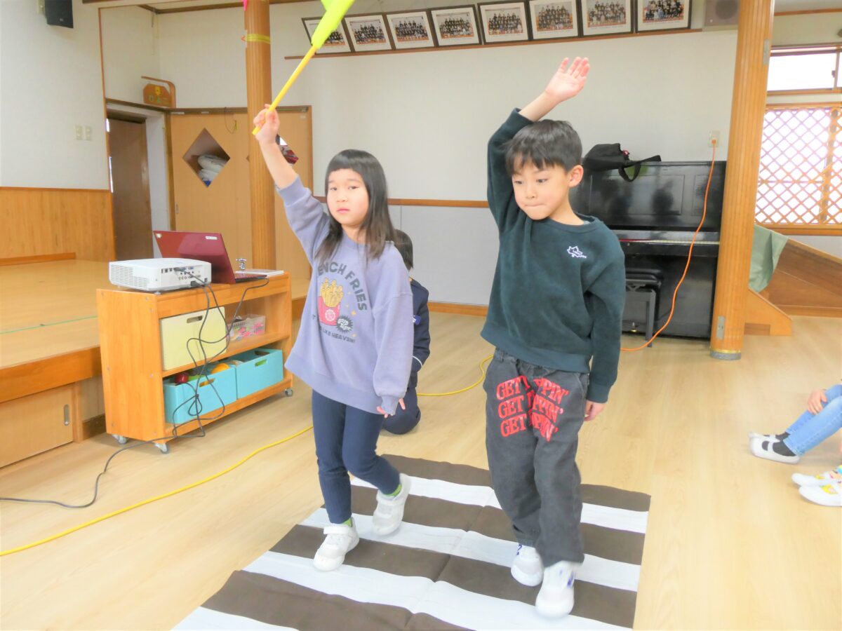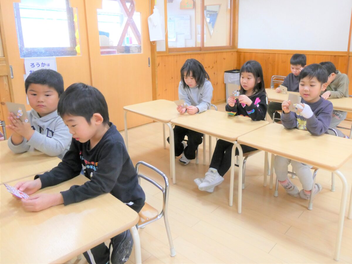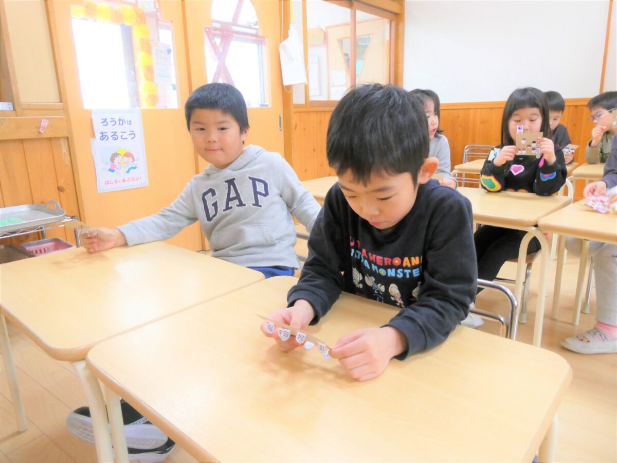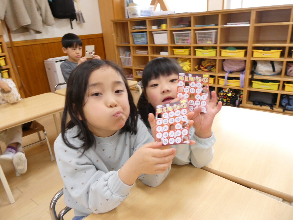 数遊びの一つとして取り入れてビンゴゲーム!1から70まで多くの数が出てきますが、数を声に出し読んだり、数をよく見てカードの中から探したりしながら、ビンゴを目指し楽しんでいた子どもたちです。