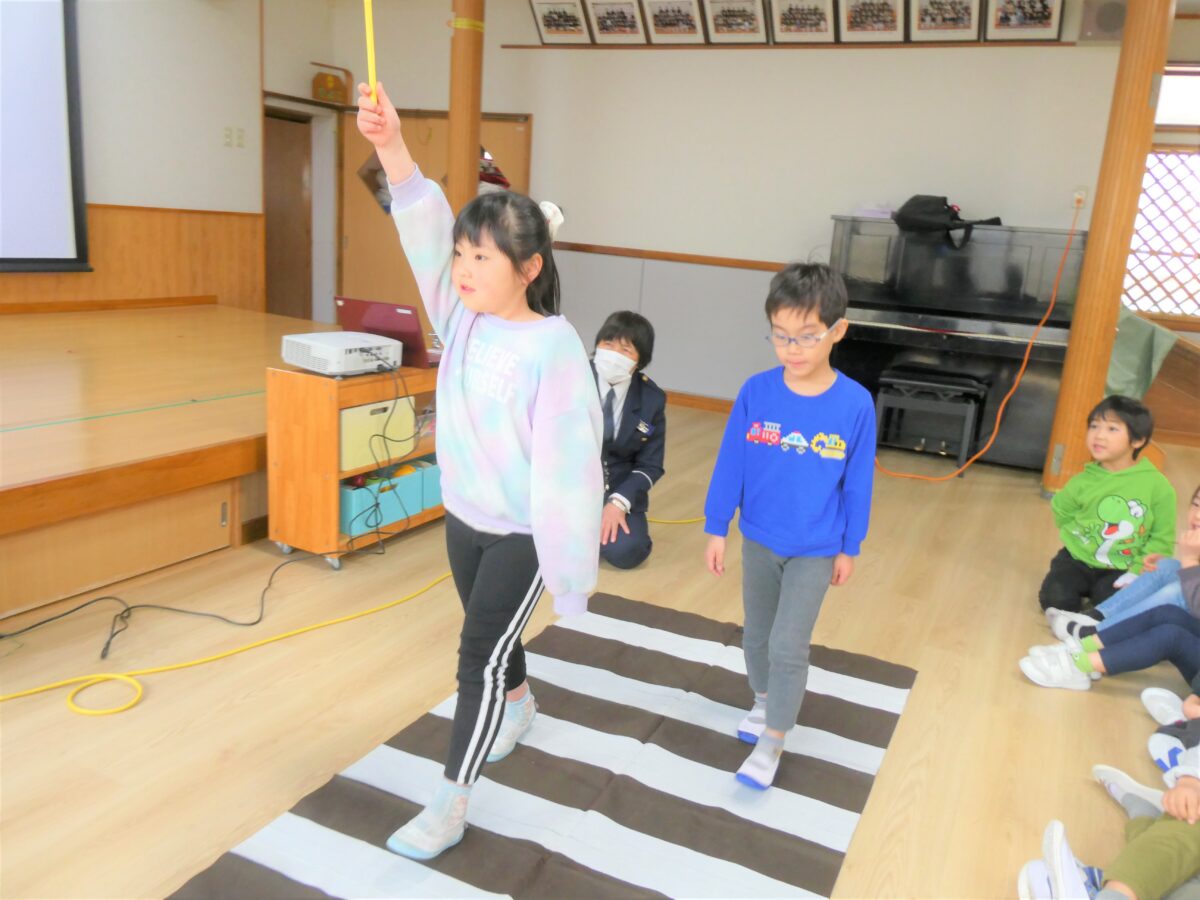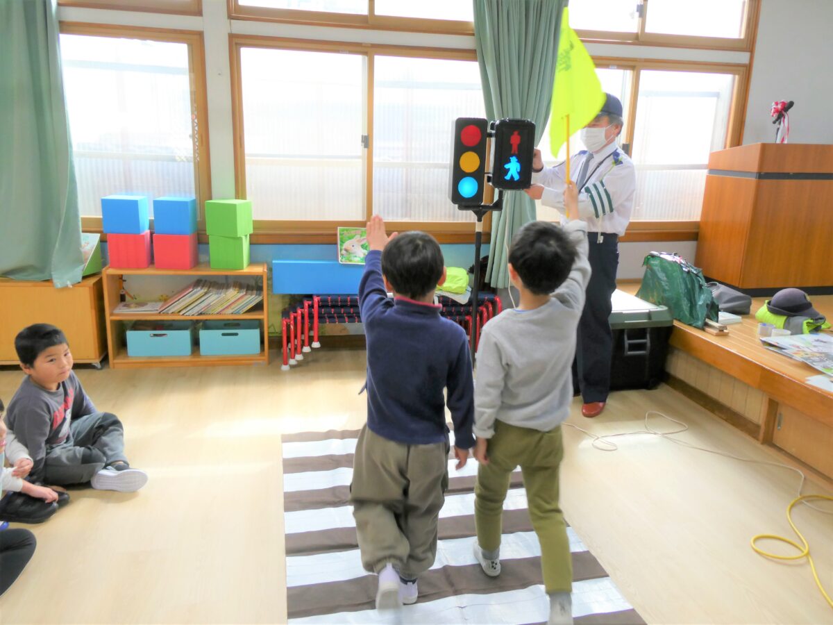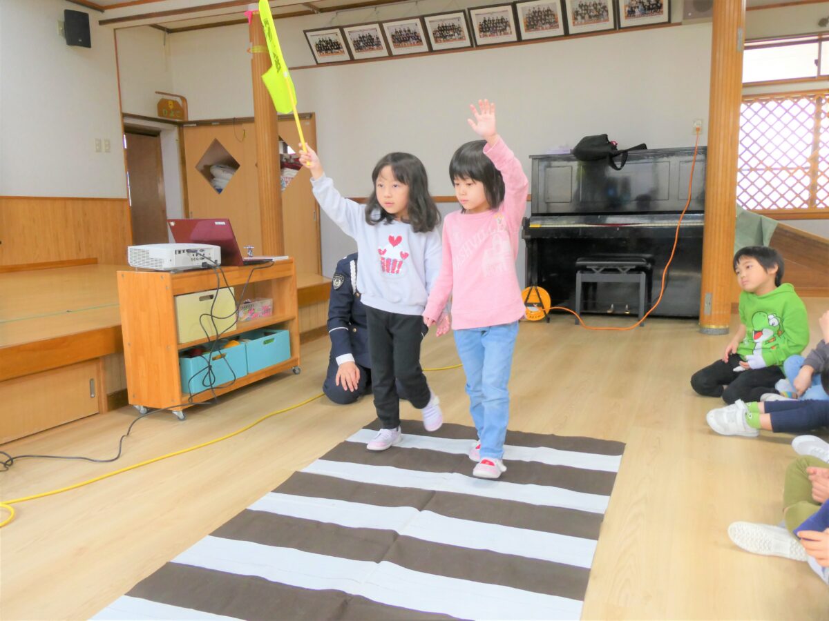 横断歩道の歩き方や信号機の見方を教えてもらい、二人一組で歩く練習をしました。