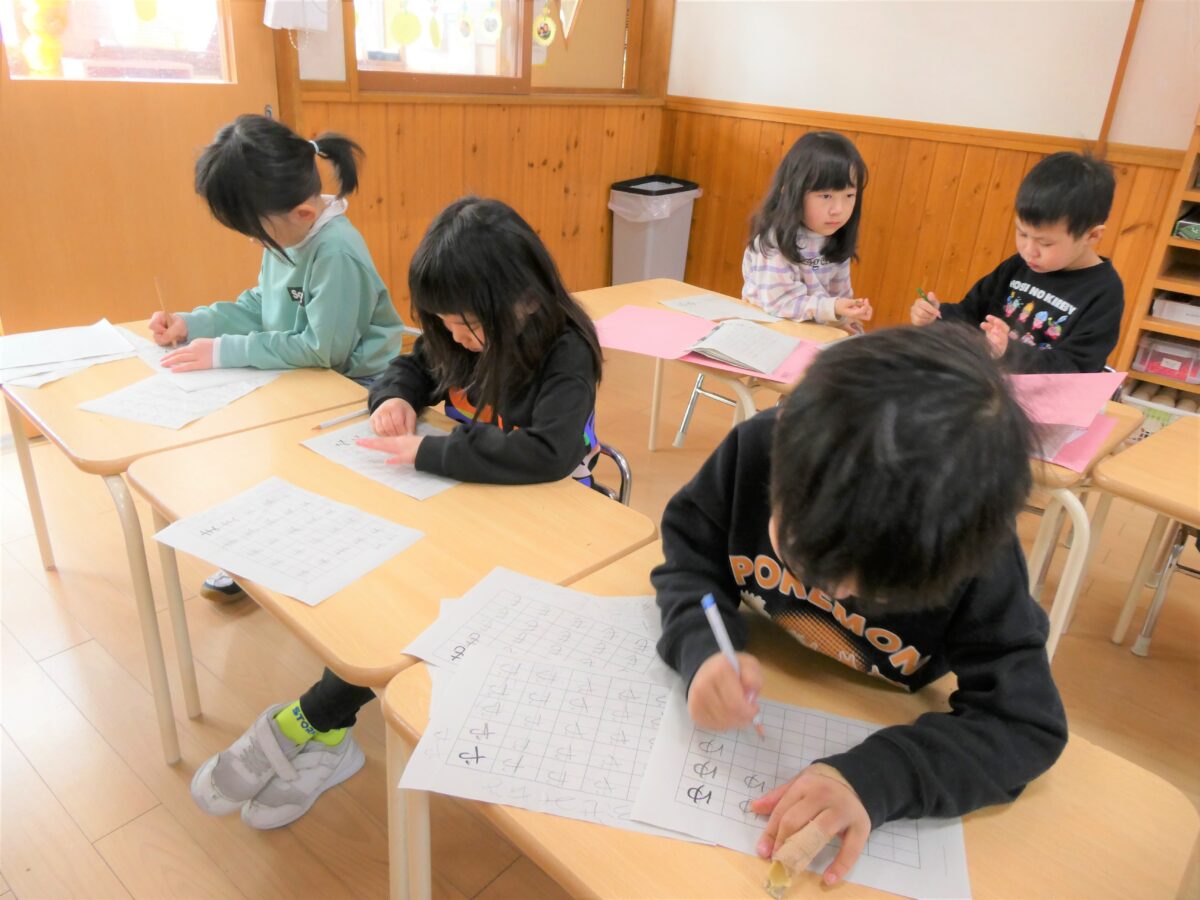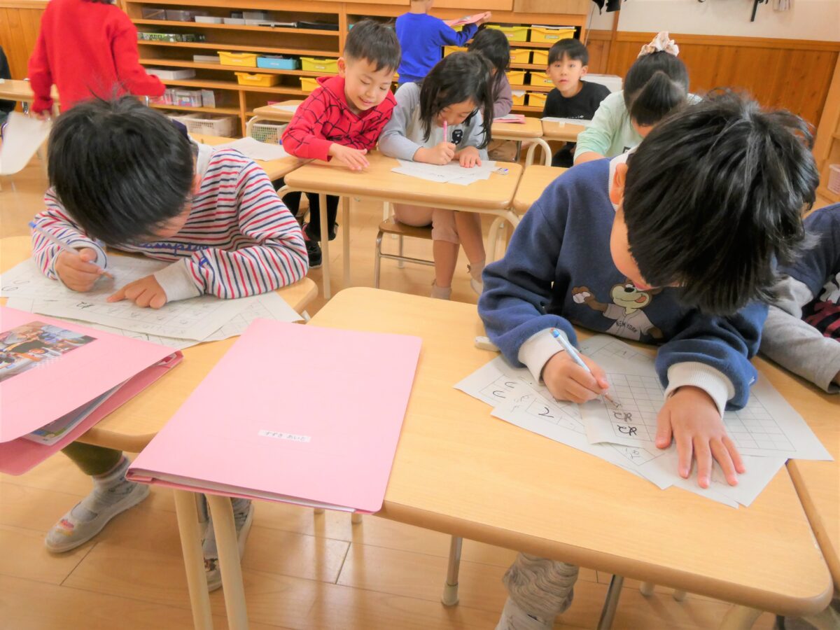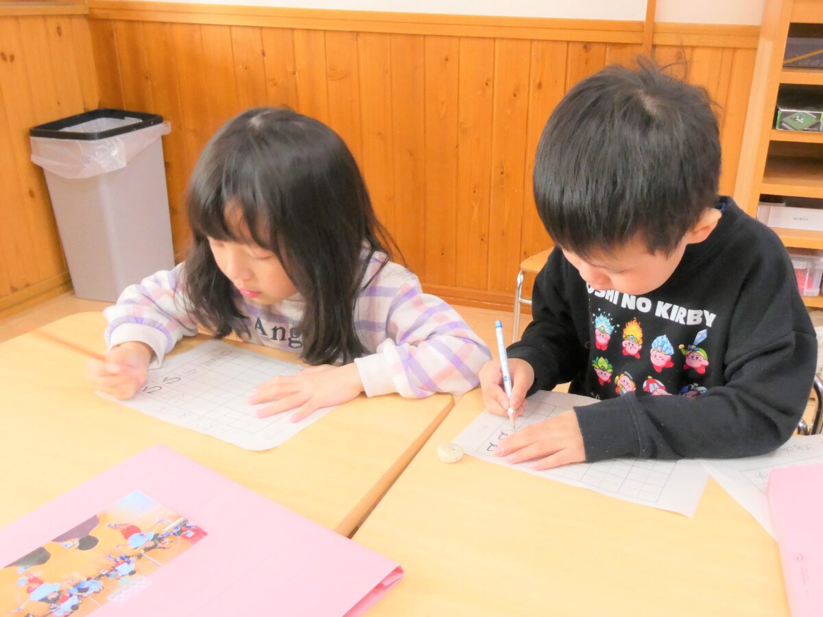 書き順や文字のバランスなど、一人ひとり丁寧に取り組み、書いた字を「先生どお?」と見せてくれます。書くことに集中している顔もみんな素敵です!