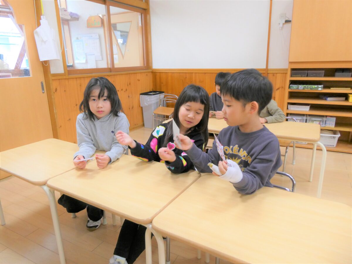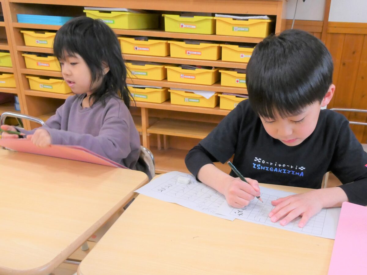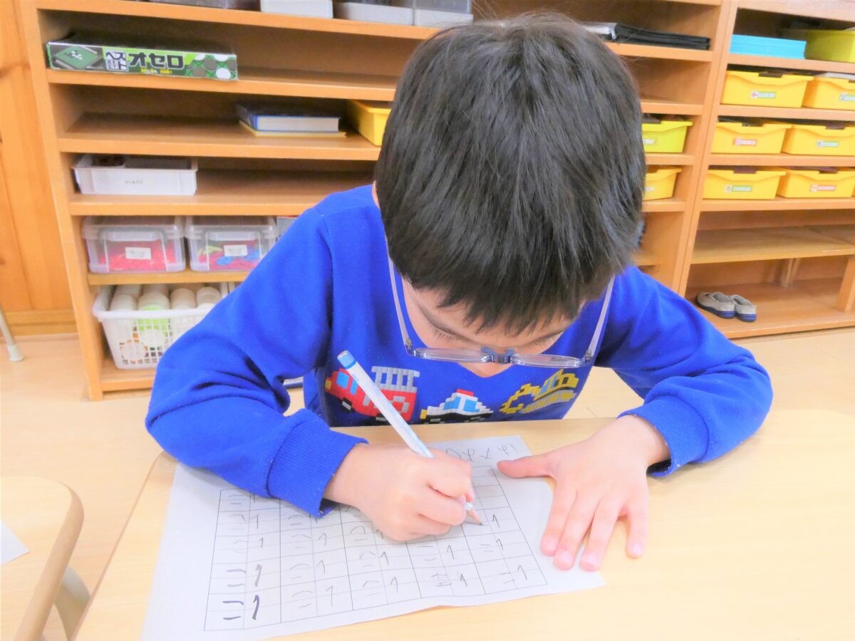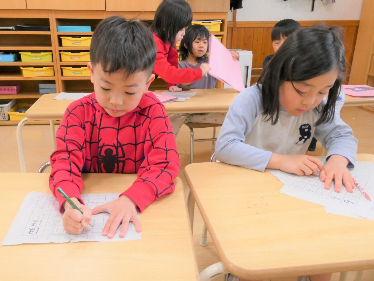書き順や文字のバランスなど、一人ひとり丁寧に取り組み、書いた字を「先生どお?」と見せてくれます。書くことに集中している顔もみんな素敵です!