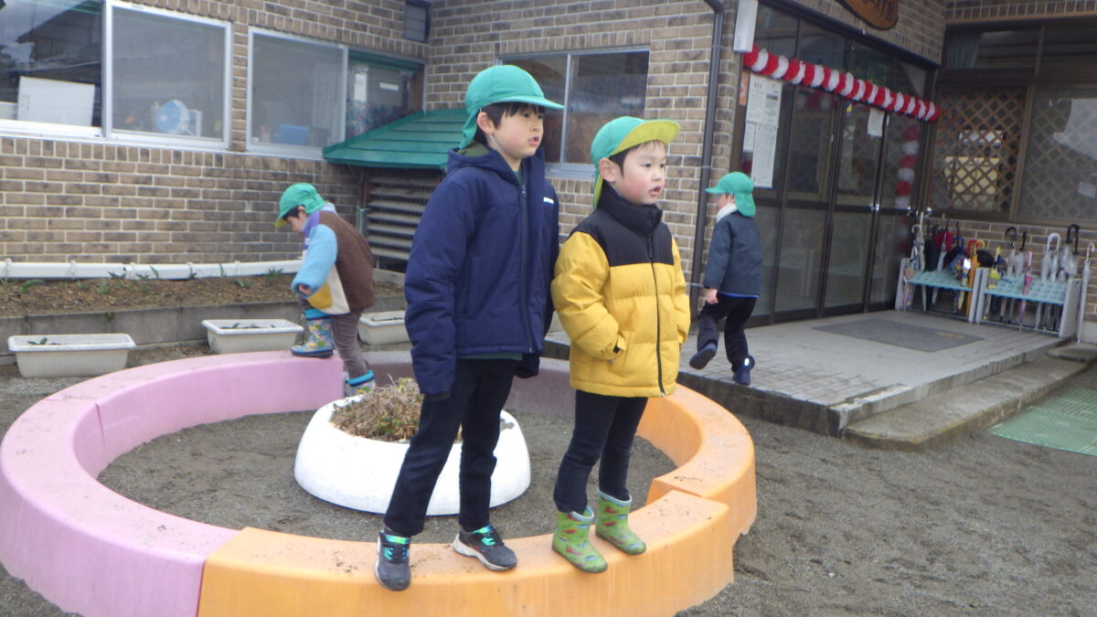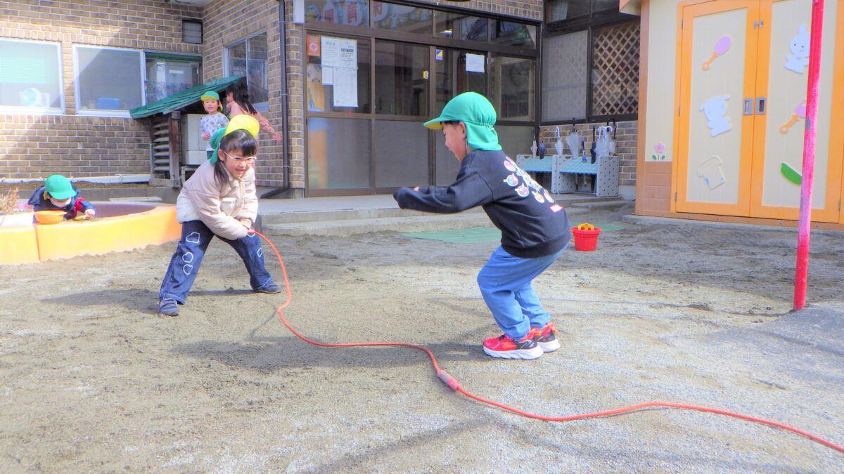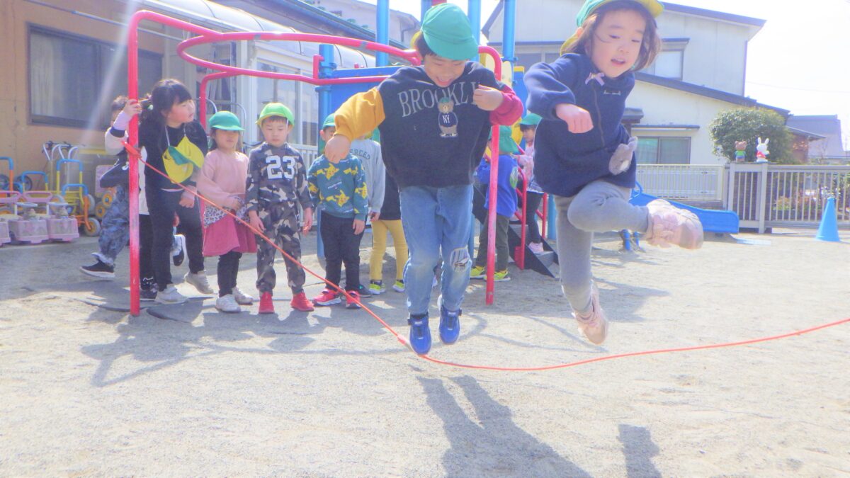 園庭では鬼ごっこや縄跳びに挑戦する姿がありました。年長さんへの憧れからいろいろへの意欲が高まっています。