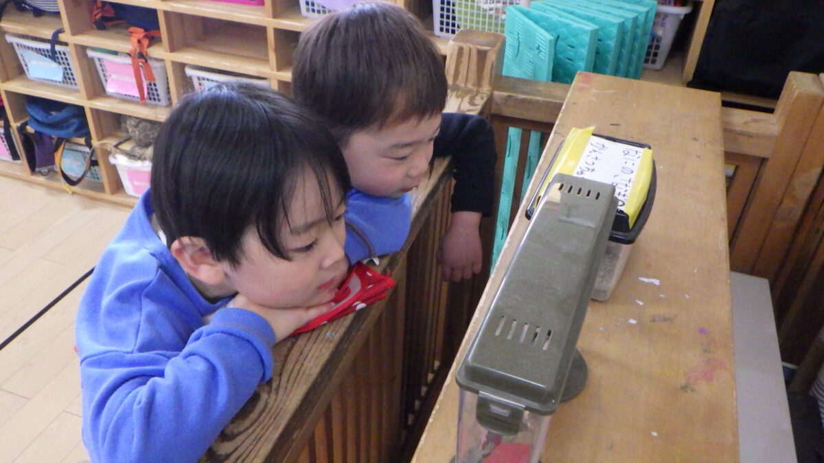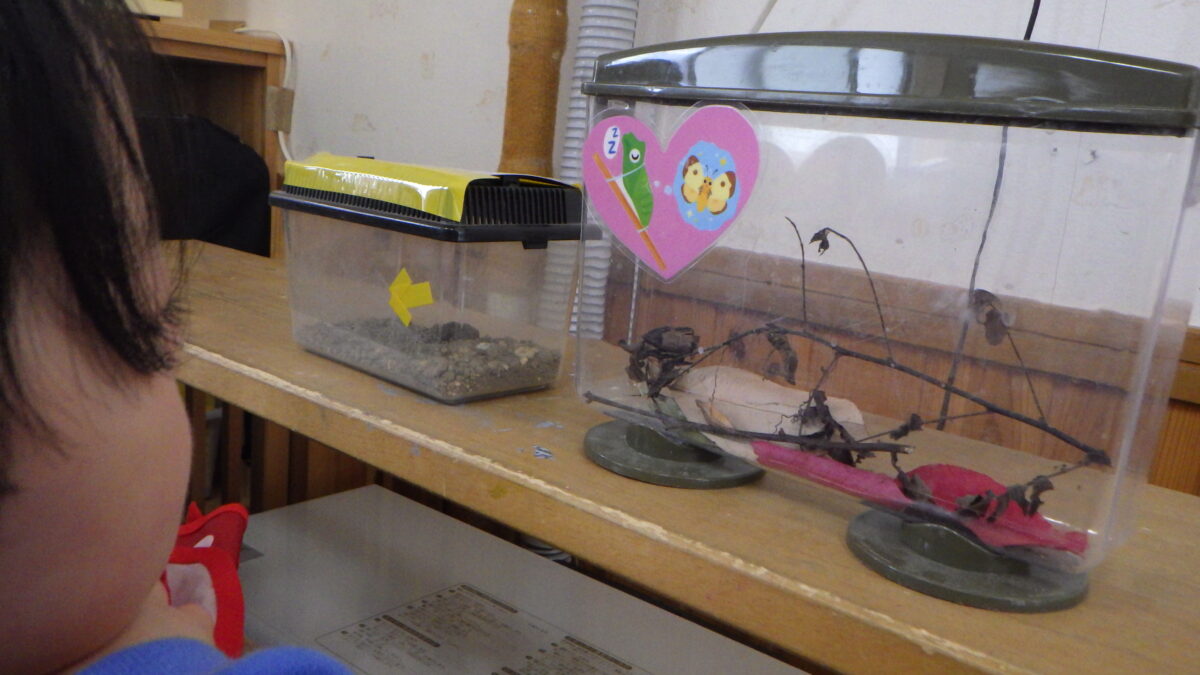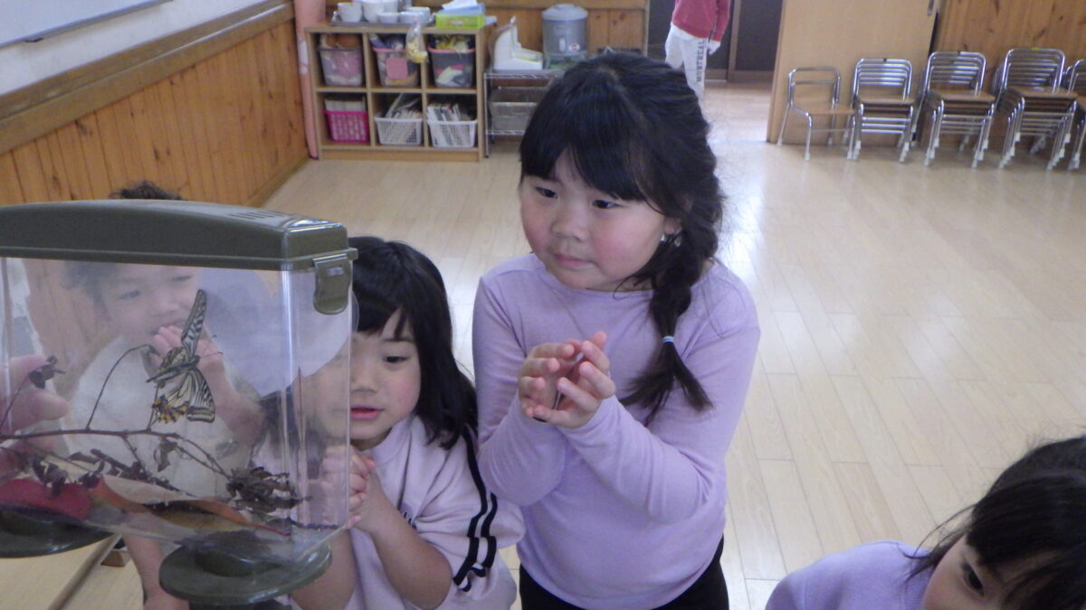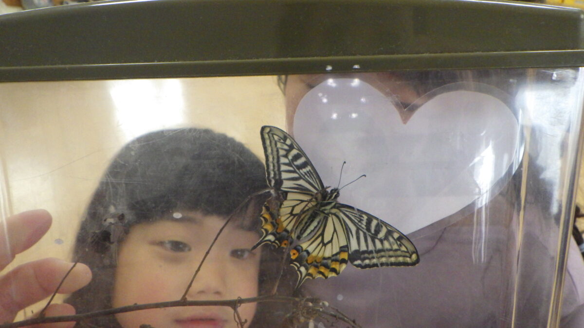 秋にさなぎになったキアゲハ、「そろそろちょうちょになるかな?」と虫かごを覗いていた子どもたちでしたが、ついに3月26日にキアゲハが誕生しました。冬を越した可愛いちょうちょを見て大感激の子どもたちでした。
