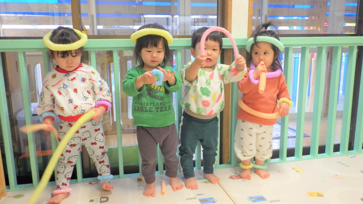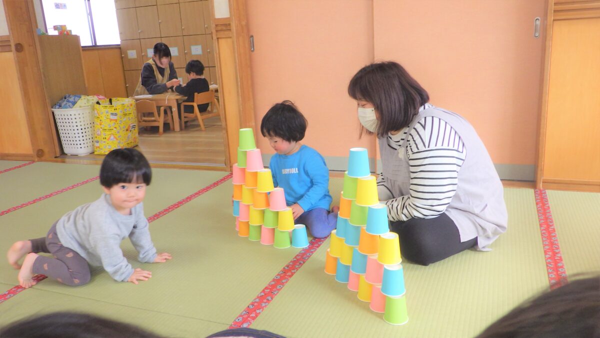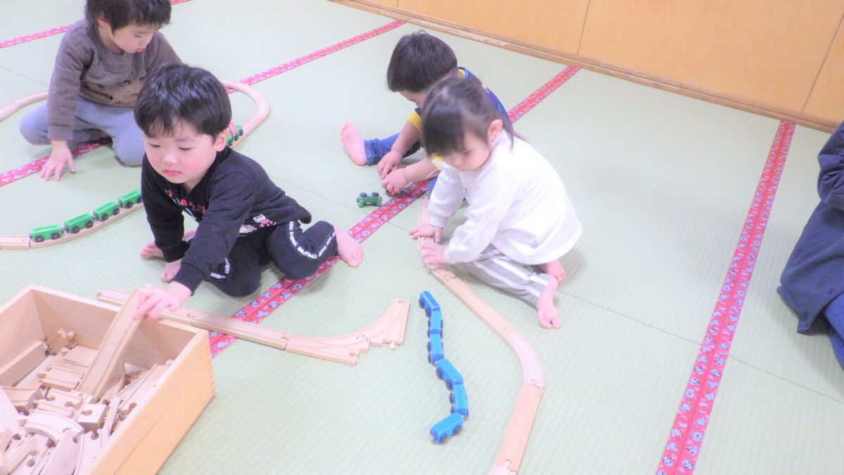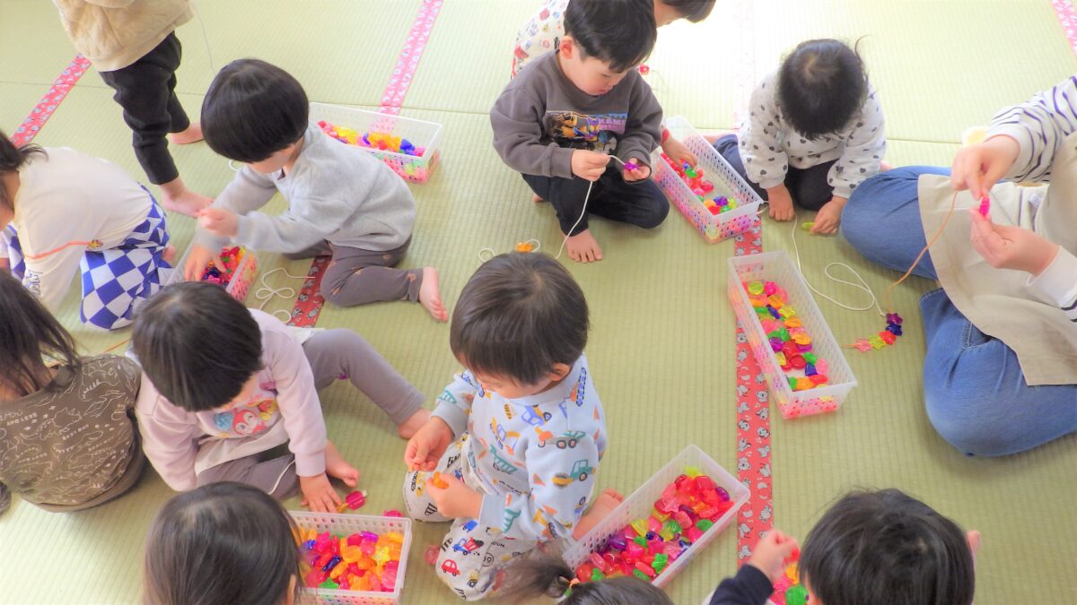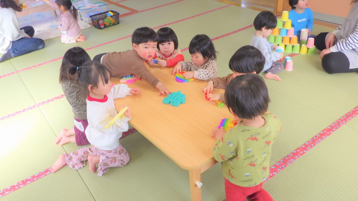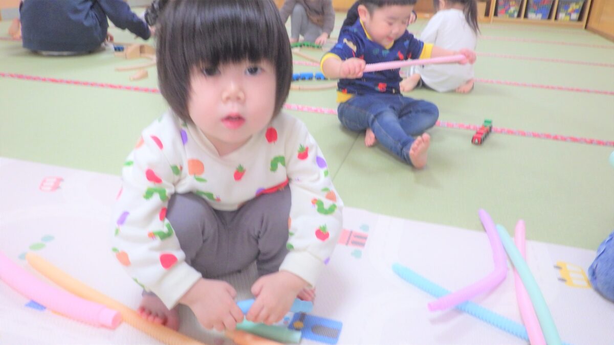 以前おたよりにものせましたが、室内遊びの中でひよこ組は自分でやりたい遊びを選べるようコーナー保育を行っています。紐通し、カップ重ね、パズル、ブロック、おままごと、木製レール、ポップチューブ、など自分のペースで色んな遊びを楽しんでいます♪
