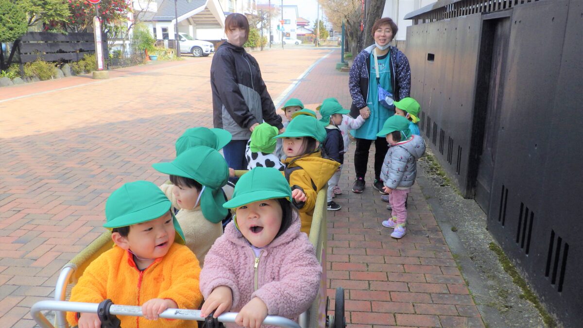 春の陽気で暖かい日差しの中お散歩を楽しみました。見る物全てが新鮮にうつり大興奮のひよこ組♪「ゴミ収集車!バス!トラック!タクシー!」工事現場で動くショベルカー、クレーン車にも遭遇して楽しい時間を沢山過ごしました。
