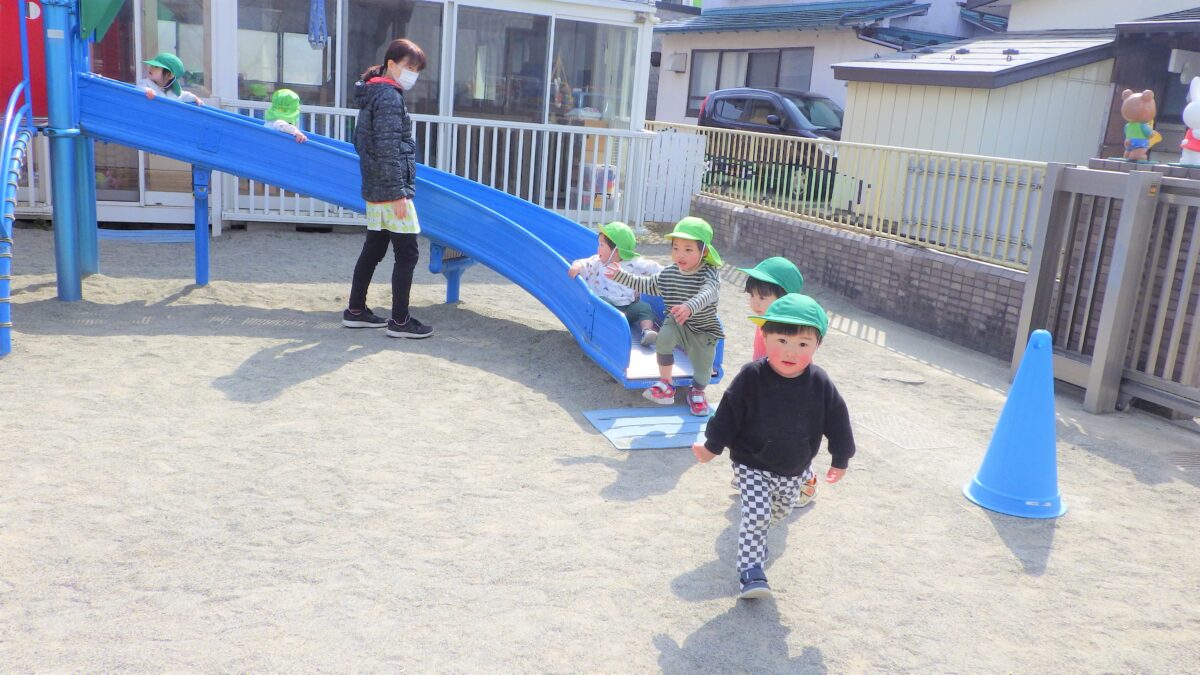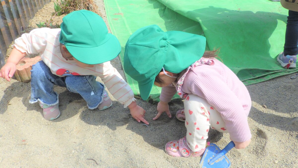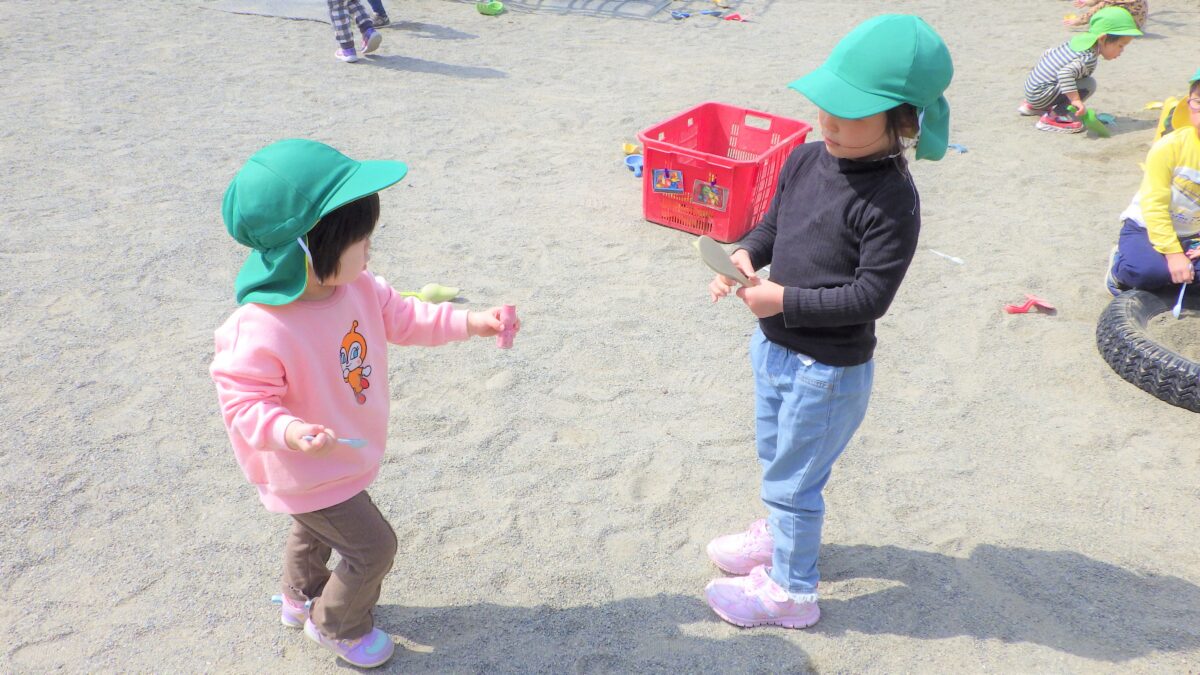 園庭では、他クラスのお友達とふれあう機会も多く良い刺激を受けています。きりん組のお兄さんお姉さんが「一緒にあそぼう」とお誘いが☆「いいよ」とお返事をし、手を繋いで園庭散歩を楽しでいました♪砂場で「かして、いいよ」とおもちゃの貸し借りも言葉を使って伝えようと頑張っていました。かくれんぼをするお兄ちゃんの真似をして「もういいか~い、もういいよ~」と声だけの参加をする子も(笑)保育園の環境を存分に楽しんでいます。